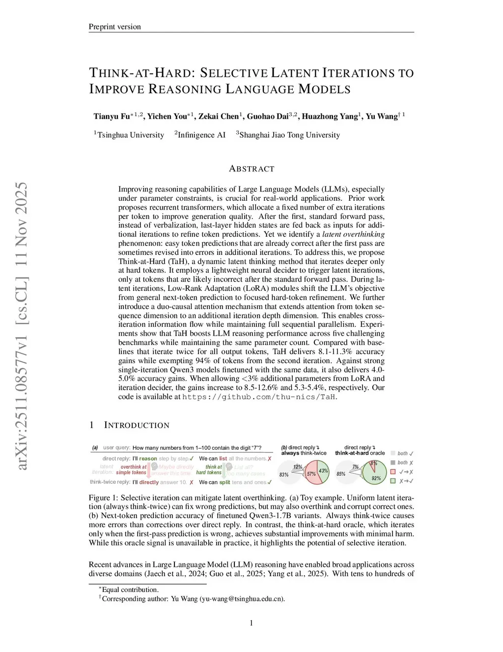 Improving reasoning capabilities of Large Language Models (LLMs), especially under parameter constraints, is crucial for real-world applications. Prior work proposes recurrent transformers, which allocate a fixed number of extra iterations per token to improve generation quality. After the first, standard forward pass, instead of verbalization, last-layer hidden states are fed back as inputs for additional iterations to refine token predictions. Yet we identify a latent overthinking phenomenon: easy token predictions that are already correct after the first pass are sometimes revised into errors in additional iterations. To address this, we propose Think-at-Hard (TaH), a dynamic latent thinking method that iterates deeper only at hard tokens. It employs a lightweight neural decider to trigger latent iterations only at tokens that are likely incorrect after the standard forward pass. During latent iterations, Low-Rank Adaptation (LoRA) modules shift the LLM objective from general next-token prediction to focused hard-token refinement. We further introduce a duo-causal attention mechanism that extends attention from the token sequence dimension to an additional iteration depth dimension. This enables cross-iteration information flow while maintaining full sequential parallelism. Experiments show that TaH boosts LLM reasoning performance across five challenging benchmarks while maintaining the same parameter count. Compared with baselines that iterate twice for all output tokens, TaH delivers 8.1-11.3% accuracy gains while exempting 94% of tokens from the second iteration. Against strong single-iteration Qwen3 models finetuned with the same data, it also delivers 4.0-5.0% accuracy gains. When allowing less than 3% additional parameters from LoRA and the iteration decider, the gains increase to 8.5-12.6% and 5.3-5.4%, respectively. Our code is available atthis https URL.