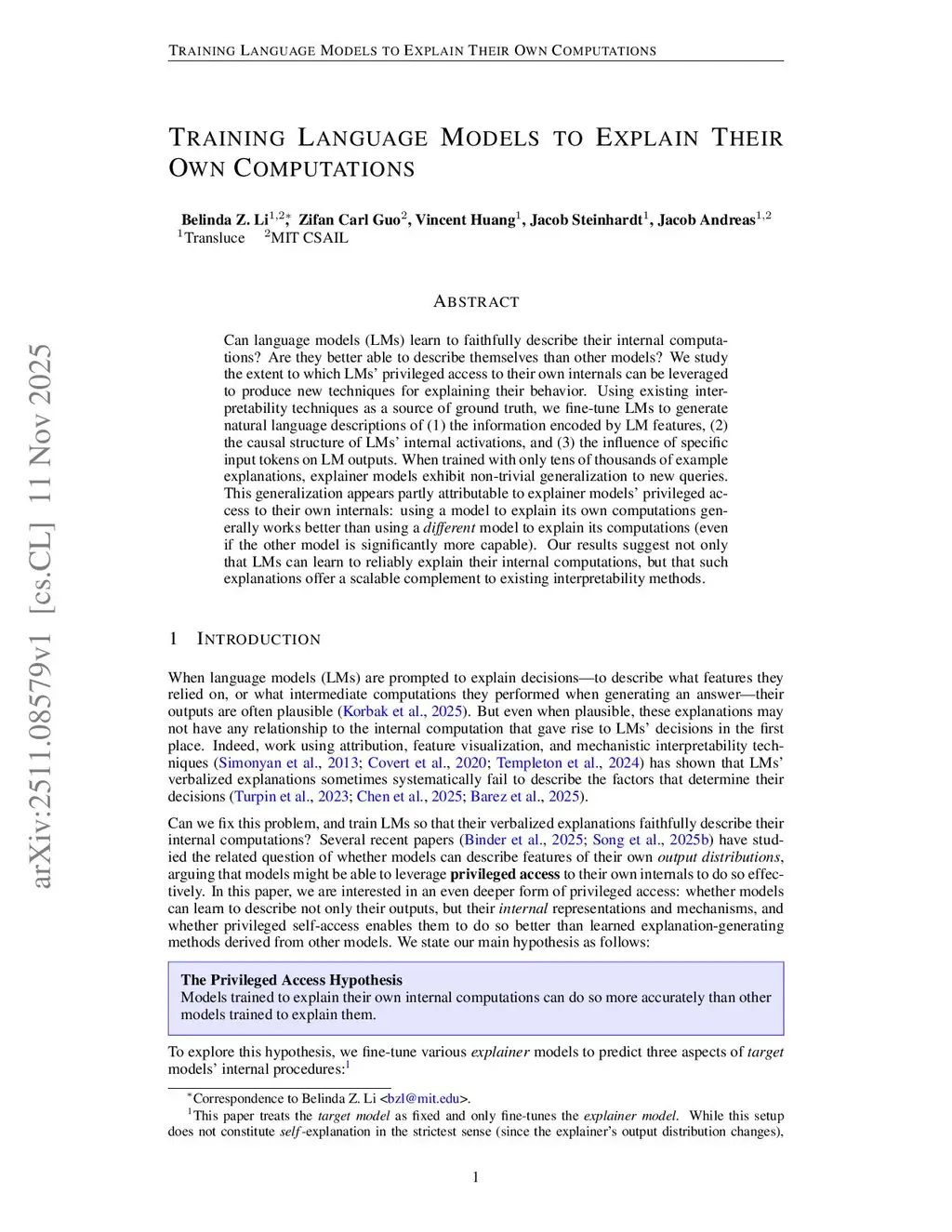 Can language models (LMs) learn to faithfully describe their internal computations? Are they better able to describe themselves than other models? We study the extent to which LMs' privileged access to their own internals can be leveraged to produce new techniques for explaining their behavior. Using existing interpretability techniques as a source of ground truth, we fine-tune LMs to generate natural language descriptions of (1) the information encoded by LM features, (2) the causal structure of LMs' internal activations, and (3) the influence of specific input tokens on LM outputs. When trained with only tens of thousands of example explanations, explainer models exhibit non-trivial generalization to new queries. This generalization appears partly attributable to explainer models' privileged access to their own internals: using a model to explain its own computations generally works better than using a *different* model to explain its computations (even if the other model is significantly more capable). Our results suggest not only that LMs can learn to reliably explain their internal computations, but that such explanations offer a scalable complement to existing interpretability methods. Code and data atthis https URL