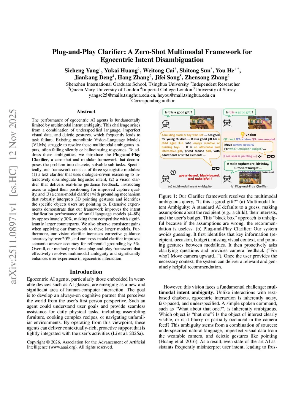 The performance of egocentric AI agents is fundamentally limited by multimodal intent ambiguity. This challenge arises from a combination of underspecified language, imperfect visual data, and deictic gestures, which frequently leads to task failure. Existing monolithic Vision-Language Models (VLMs) struggle to resolve these multimodal ambiguous inputs, often failing silently or hallucinating responses. To address these ambiguities, we introduce the Plug-and-Play Clarifier, a zero-shot and modular framework that decomposes the problem into discrete, solvable sub-tasks. Specifically, our framework consists of three synergistic modules: (1) a text clarifier that uses dialogue-driven reasoning to interactively disambiguate linguistic intent, (2) a vision clarifier that delivers real-time guidance feedback, instructing users to adjust their positioning for improved capture quality, and (3) a cross-modal clarifier with grounding mechanism that robustly interprets 3D pointing gestures and identifies the specific objects users are pointing to. Extensive experiments demonstrate that our framework improves the intent clarification performance of small language models (4--8B) by approximately 30%, making them competitive with significantly larger counterparts. We also observe consistent gains when applying our framework to these larger models. Furthermore, our vision clarifier increases corrective guidance accuracy by over 20%, and our cross-modal clarifier improves semantic answer accuracy for referential grounding by 5%. Overall, our method provides a plug-and-play framework that effectively resolves multimodal ambiguity and significantly enhances user experience in egocentric interaction.