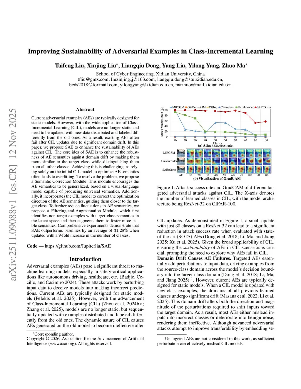 Current adversarial examples (AEs) are typically designed for static models. However, with the wide application of Class-Incremental Learning (CIL), models are no longer static and need to be updated with new data distributed and labeled differently from the old ones. As a result, existing AEs often fail after CIL updates due to significant domain drift. In this paper, we propose SAE to enhance the sustainability of AEs against CIL. The core idea of SAE is to enhance the robustness of AE semantics against domain drift by making them more similar to the target class while distinguishing them from all other classes. Achieving this is challenging, as relying solely on the initial CIL model to optimize AE semantics often leads to overfitting. To resolve the problem, we propose a Semantic Correction Module. This module encourages the AE semantics to be generalized, based on a visual-language model capable of producing universal semantics. Additionally, it incorporates the CIL model to correct the optimization direction of the AE semantics, guiding them closer to the target class. To further reduce fluctuations in AE semantics, we propose a Filtering-and-Augmentation Module, which first identifies non-target examples with target-class semantics in the latent space and then augments them to foster more stable semantics. Comprehensive experiments demonstrate that SAE outperforms baselines by an average of 31.28% when updated with a 9-fold increase in the number of classes.