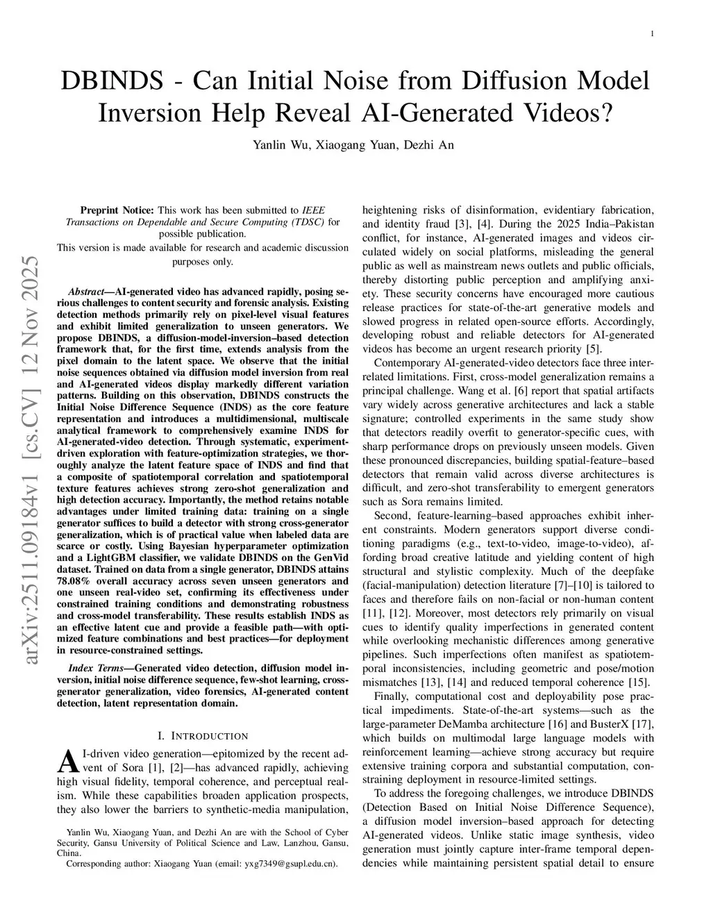 AI-generated video has advanced rapidly and poses serious challenges to content security and forensic analysis. Existing detectors rely mainly on pixel-level visual cues and generalize poorly to unseen generators. We propose DBINDS, a diffusion-model-inversion based detector that analyzes latent-space dynamics rather than pixels. We find that initial noise sequences recovered by diffusion inversion differ systematically between real and generated videos. Building on this, DBINDS forms an Initial Noise Difference Sequence (INDS) and extracts multi-domain, multi-scale features. With feature optimization and a LightGBM classifier tuned by Bayesian search, DBINDS (trained on a single generator) achieves strong cross-generator performance on GenVidBench, demonstrating good generalization and robustness in limited-data settings.
