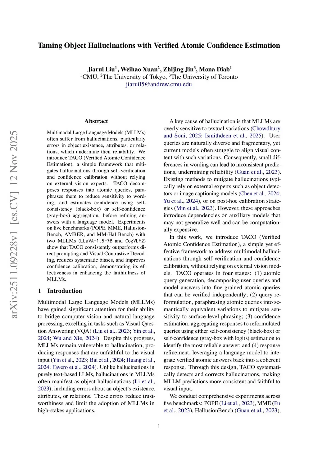 Multimodal Large Language Models (MLLMs) often suffer from hallucinations, particularly errors in object existence, attributes, or relations, which undermine their reliability. We introduce TACO (Verified Atomic Confidence Estimation), a simple framework that mitigates hallucinations through self-verification and confidence calibration without relying on external vision experts. TACO decomposes responses into atomic queries, paraphrases them to reduce sensitivity to wording, and estimates confidence using self-consistency (black-box) or self-confidence (gray-box) aggregation, before refining answers with a language model. Experiments on five benchmarks (POPE, MME, HallusionBench, AMBER, and MM-Hal Bench) with two MLLMs (\texttt{LLaVA-1.5-7B} and \texttt{CogVLM2}) show that TACO consistently outperforms direct prompting and Visual Contrastive Decoding, reduces systematic biases, and improves confidence calibration, demonstrating its effectiveness in enhancing the faithfulness of MLLMs.