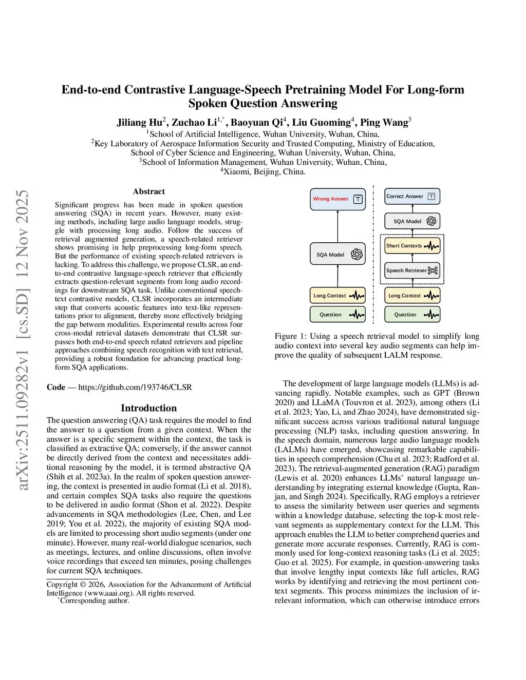 End-to-end Contrastive Language-Speech Pretraining Model For Long-form Spoken Question Answering