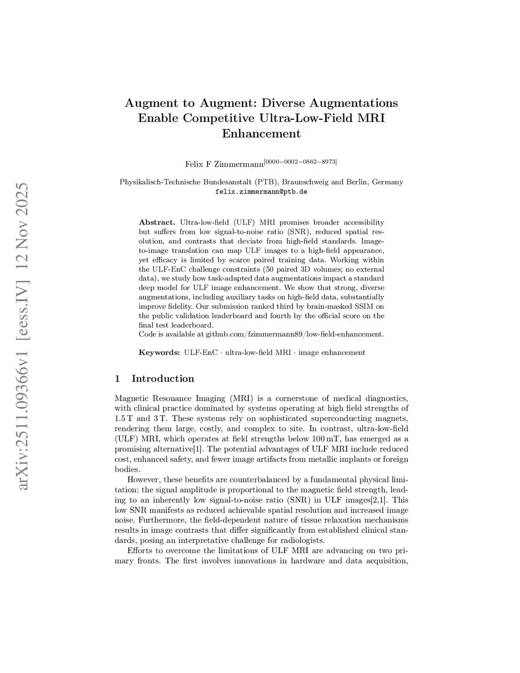 Ultra-low-field (ULF) MRI promises broader accessibility but suffers from low signal-to-noise ratio (SNR), reduced spatial resolution, and contrasts that deviate from high-field standards. Imageto- image translation can map ULF images to a high-field appearance, yet efficacy is limited by scarce paired training data. Working within the ULF-EnC challenge constraints (50 paired 3D volumes; no external data), we study how task-adapted data augmentations impact a standard deep model for ULF image enhancement. We show that strong, diverse augmentations, including auxiliary tasks on high-field data, substantially improve fidelity. Our submission ranked third by brain-masked SSIM on the public validation leaderboard and fourth by the official score on the final test leaderboard. Code is available atthis https URL.