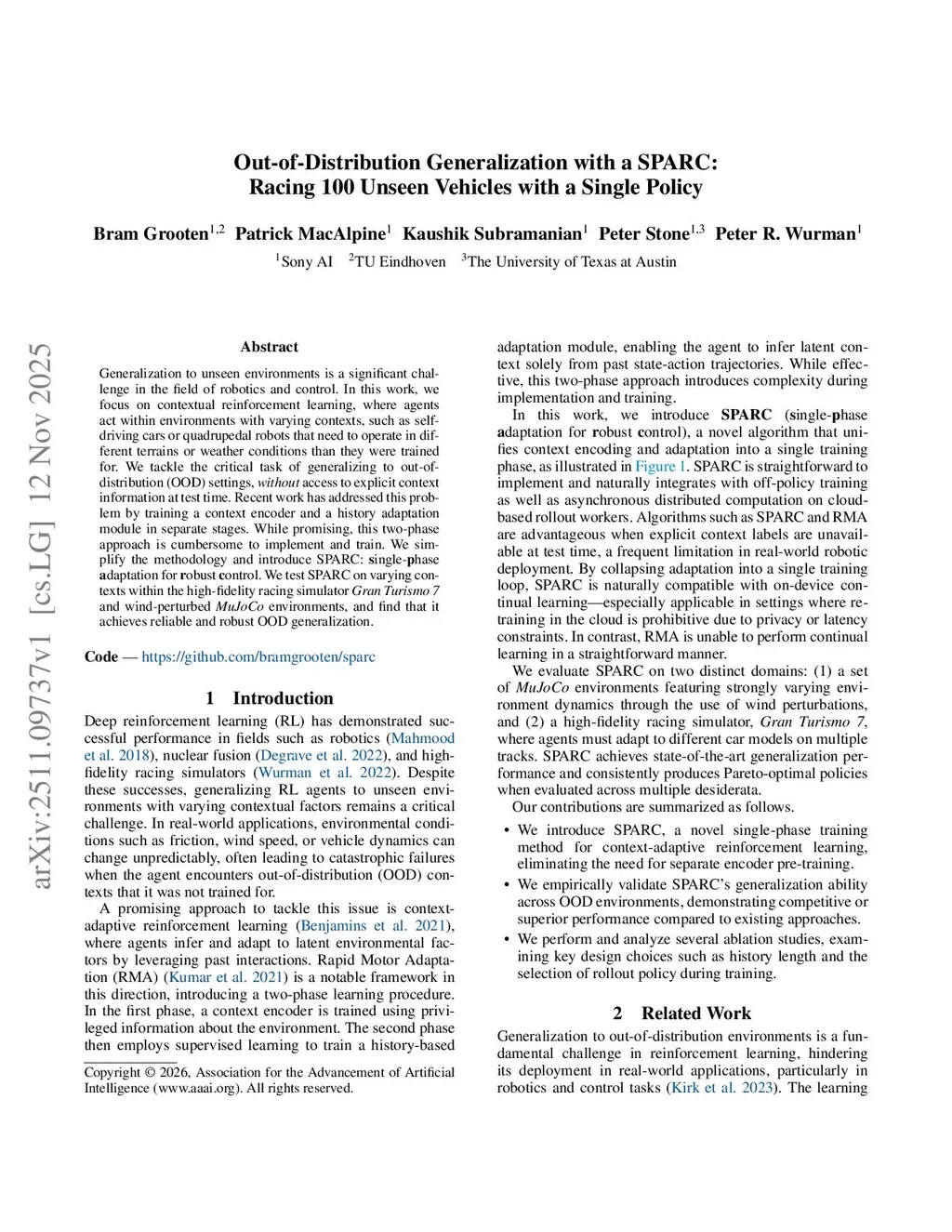 Generalization to unseen environments is a significant challenge in the field of robotics and control. In this work, we focus on contextual reinforcement learning, where agents act within environments with varying contexts, such as self-driving cars or quadrupedal robots that need to operate in different terrains or weather conditions than they were trained for. We tackle the critical task of generalizing to out-of-distribution (OOD) settings, without access to explicit context information at test time. Recent work has addressed this problem by training a context encoder and a history adaptation module in separate stages. While promising, this two-phase approach is cumbersome to implement and train. We simplify the methodology and introduce SPARC: single-phase adaptation for robust control. We test SPARC on varying contexts within the high-fidelity racing simulator Gran Turismo 7 and wind-perturbed MuJoCo environments, and find that it achieves reliable and robust OOD generalization.