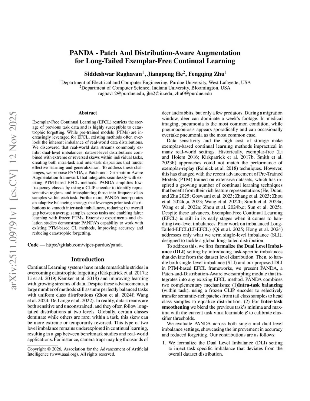 Exemplar-Free Continual Learning (EFCL) restricts the storage of previous task data and is highly susceptible to catastrophic forgetting. While pre-trained models (PTMs) are increasingly leveraged for EFCL, existing methods often overlook the inherent imbalance of real-world data distributions. We discovered that real-world data streams commonly exhibit dual-level imbalances, dataset-level distributions combined with extreme or reversed skews within individual tasks, creating both intra-task and inter-task disparities that hinder effective learning and generalization. To address these challenges, we propose PANDA, a Patch-and-Distribution-Aware Augmentation framework that integrates seamlessly with existing PTM-based EFCL methods. PANDA amplifies low-frequency classes by using a CLIP encoder to identify representative regions and transplanting those into frequent-class samples within each task. Furthermore, PANDA incorporates an adaptive balancing strategy that leverages prior task distributions to smooth inter-task imbalances, reducing the overall gap between average samples across tasks and enabling fairer learning with frozen PTMs. Extensive experiments and ablation studies demonstrate PANDA's capability to work with existing PTM-based CL methods, improving accuracy and reducing catastrophic forgetting.