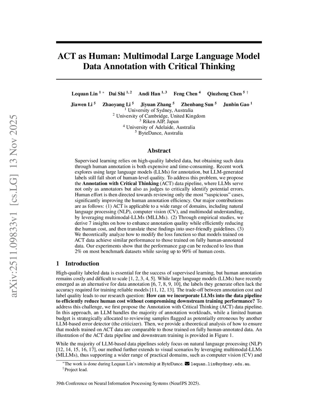 Supervised learning relies on high-quality labeled data, but obtaining such data through human annotation is both expensive and time-consuming. Recent work explores using large language models (LLMs) for annotation, but LLM-generated labels still fall short of human-level quality. To address this problem, we propose the Annotation with Critical Thinking (ACT) data pipeline, where LLMs serve not only as annotators but also as judges to critically identify potential errors. Human effort is then directed towards reviewing only the most "suspicious" cases, significantly improving the human annotation efficiency. Our major contributions are as follows: (1) ACT is applicable to a wide range of domains, including natural language processing (NLP), computer vision (CV), and multimodal understanding, by leveraging multimodal-LLMs (MLLMs). (2) Through empirical studies, we derive 7 insights on how to enhance annotation quality while efficiently reducing the human cost, and then translate these findings into user-friendly guidelines. (3) We theoretically analyze how to modify the loss function so that models trained on ACT data achieve similar performance to those trained on fully human-annotated data. Our experiments show that the performance gap can be reduced to less than 2% on most benchmark datasets while saving up to 90% of human costs.