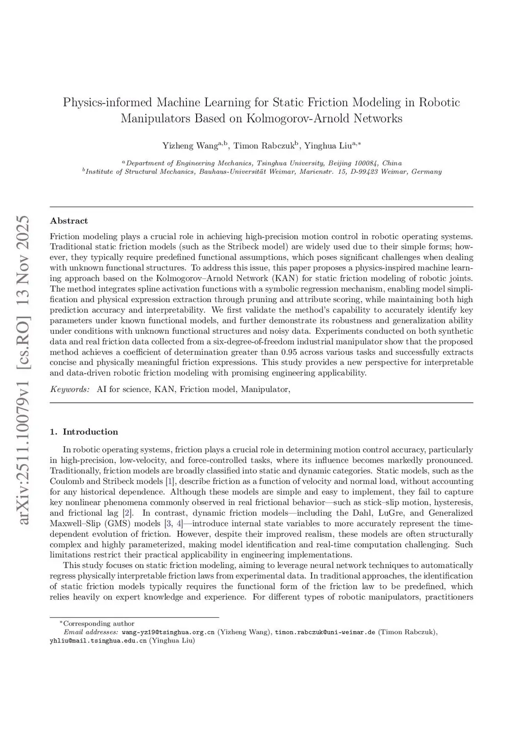 Friction modeling plays a crucial role in achieving high-precision motion control in robotic operating systems. Traditional static friction models (such as the Stribeck model) are widely used due to their simple forms; however, they typically require predefined functional assumptions, which poses significant challenges when dealing with unknown functional structures. To address this issue, this paper proposes a physics-inspired machine learning approach based on the Kolmogorov Arnold Network (KAN) for static friction modeling of robotic joints. The method integrates spline activation functions with a symbolic regression mechanism, enabling model simplification and physical expression extraction through pruning and attribute scoring, while maintaining both high prediction accuracy and interpretability. We first validate the method's capability to accurately identify key parameters under known functional models, and further demonstrate its robustness and generalization ability under conditions with unknown functional structures and noisy data. Experiments conducted on both synthetic data and real friction data collected from a six-degree-of-freedom industrial manipulator show that the proposed method achieves a coefficient of determination greater than 0.95 across various tasks and successfully extracts concise and physically meaningful friction expressions. This study provides a new perspective for interpretable and data-driven robotic friction modeling with promising engineering applicability.