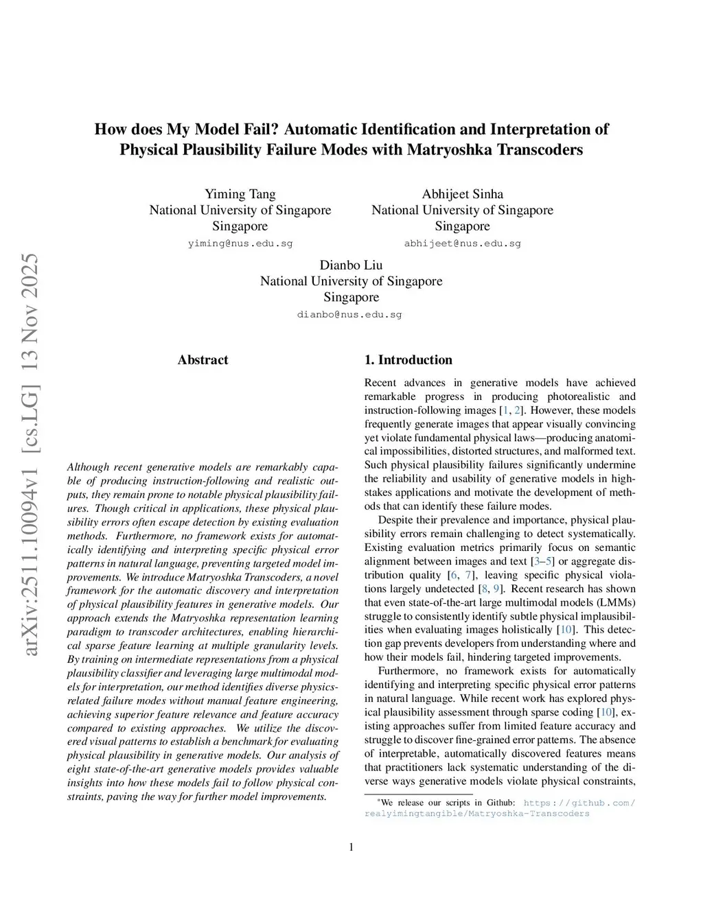 Although recent generative models are remarkably capable of producing instruction-following and realistic outputs, they remain prone to notable physical plausibility failures. Though critical in applications, these physical plausibility errors often escape detection by existing evaluation methods. Furthermore, no framework exists for automatically identifying and interpreting specific physical error patterns in natural language, preventing targeted model improvements. We introduce Matryoshka Transcoders, a novel framework for the automatic discovery and interpretation of physical plausibility features in generative models. Our approach extends the Matryoshka representation learning paradigm to transcoder architectures, enabling hierarchical sparse feature learning at multiple granularity levels. By training on intermediate representations from a physical plausibility classifier and leveraging large multimodal models for interpretation, our method identifies diverse physics-related failure modes without manual feature engineering, achieving superior feature relevance and feature accuracy compared to existing approaches. We utilize the discovered visual patterns to establish a benchmark for evaluating physical plausibility in generative models. Our analysis of eight state-of-the-art generative models provides valuable insights into how these models fail to follow physical constraints, paving the way for further model improvements.