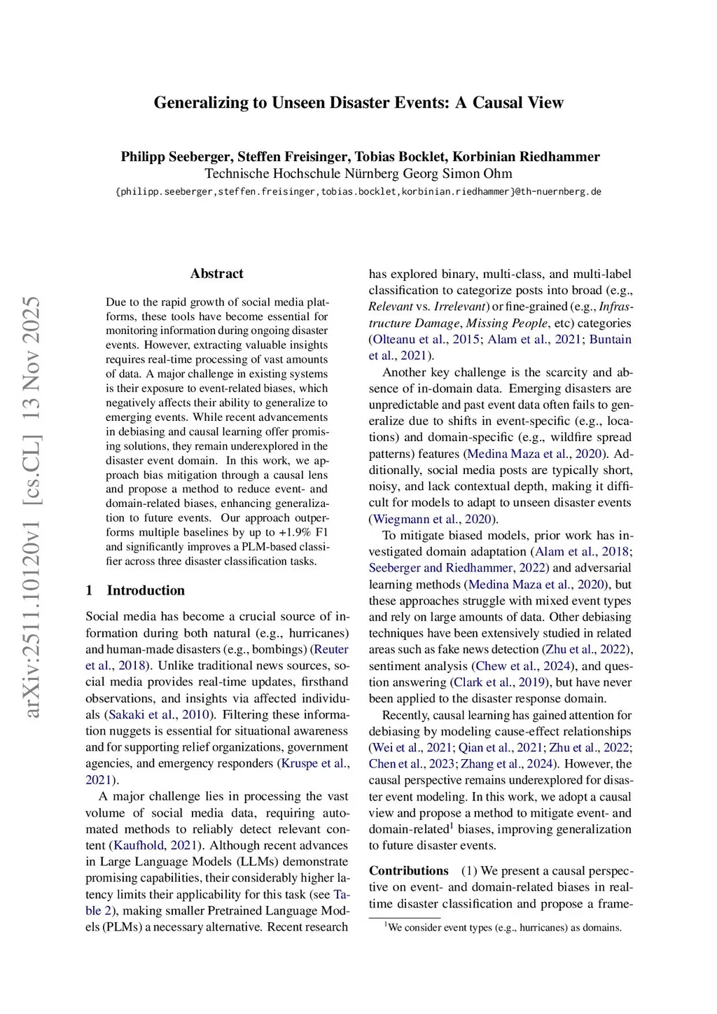 Due to the rapid growth of social media platforms, these tools have become essential for monitoring information during ongoing disaster events. However, extracting valuable insights requires real-time processing of vast amounts of data. A major challenge in existing systems is their exposure to event-related biases, which negatively affects their ability to generalize to emerging events. While recent advancements in debiasing and causal learning offer promising solutions, they remain underexplored in the disaster event domain. In this work, we approach bias mitigation through a causal lens and propose a method to reduce event- and domain-related biases, enhancing generalization to future events. Our approach outperforms multiple baselines by up to +1.9% F1 and significantly improves a PLM-based classifier across three disaster classification tasks.