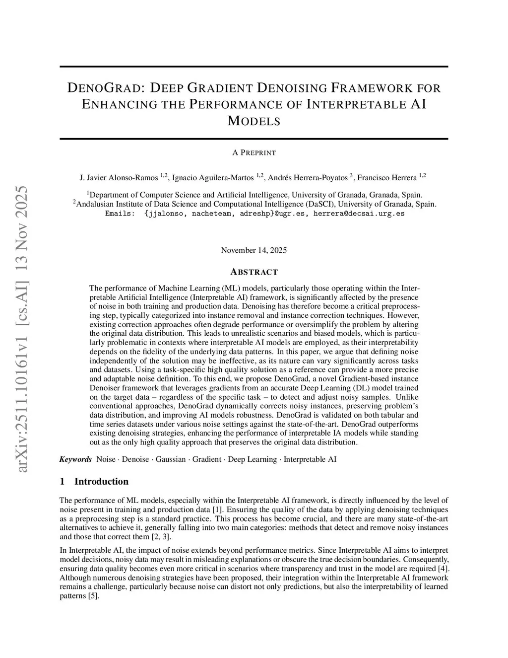 The performance of Machine Learning (ML) models, particularly those operating within the Interpretable Artificial Intelligence (Interpretable AI) framework, is significantly affected by the presence of noise in both training and production data. Denoising has therefore become a critical preprocessing step, typically categorized into instance removal and instance correction techniques. However, existing correction approaches often degrade performance or oversimplify the problem by altering the original data distribution. This leads to unrealistic scenarios and biased models, which is particularly problematic in contexts where interpretable AI models are employed, as their interpretability depends on the fidelity of the underlying data patterns. In this paper, we argue that defining noise independently of the solution may be ineffective, as its nature can vary significantly across tasks and datasets. Using a task-specific high quality solution as a reference can provide a more precise and adaptable noise definition. To this end, we propose DenoGrad, a novel Gradient-based instance Denoiser framework that leverages gradients from an accurate Deep Learning (DL) model trained on the target data -- regardless of the specific task -- to detect and adjust noisy samples. Unlike conventional approaches, DenoGrad dynamically corrects noisy instances, preserving problem's data distribution, and improving AI models robustness. DenoGrad is validated on both tabular and time series datasets under various noise settings against the state-of-the-art. DenoGrad outperforms existing denoising strategies, enhancing the performance of interpretable IA models while standing out as the only high quality approach that preserves the original data distribution.