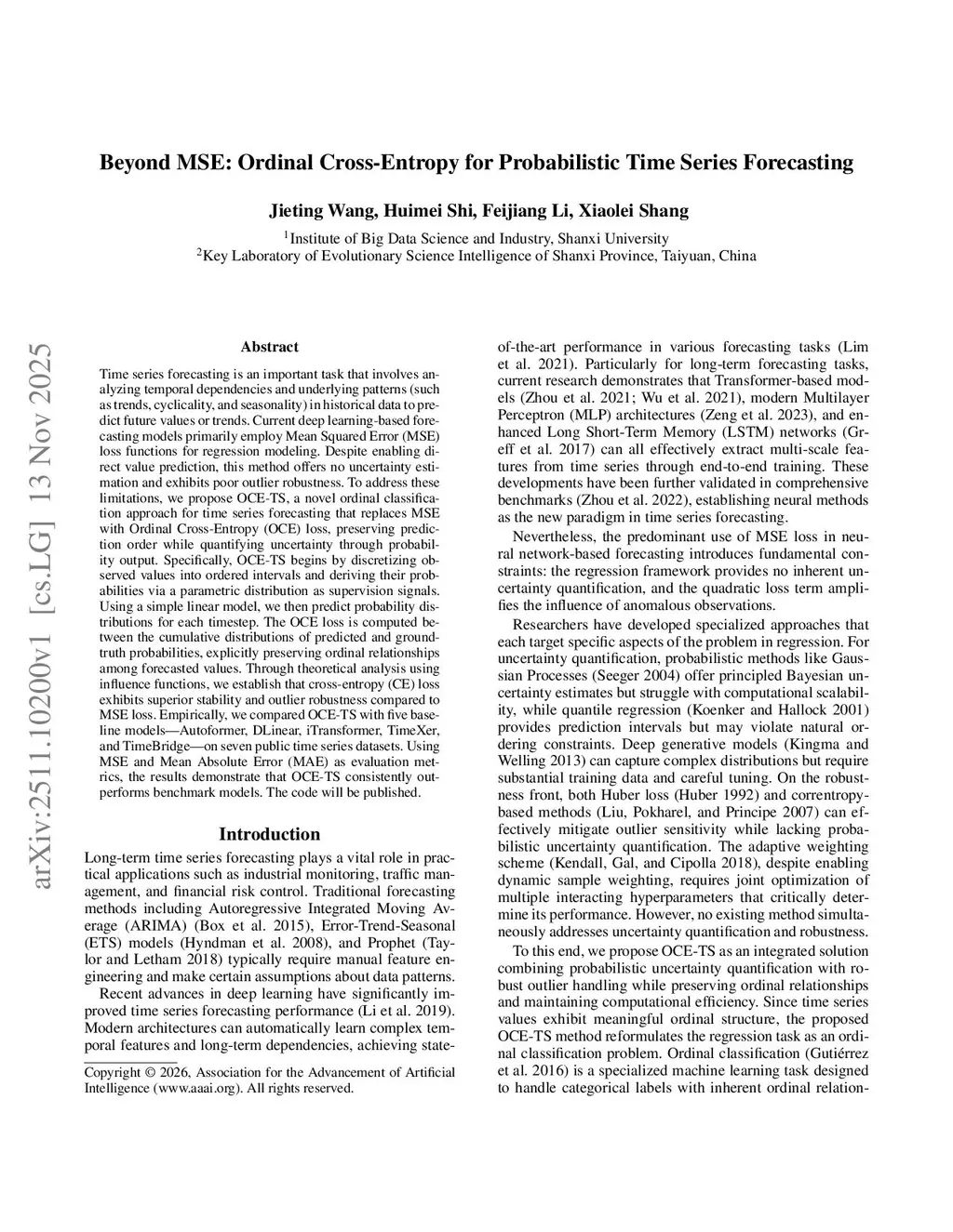 Time series forecasting is an important task that involves analyzing temporal dependencies and underlying patterns (such as trends, cyclicality, and seasonality) in historical data to predict future values or trends. Current deep learning-based forecasting models primarily employ Mean Squared Error (MSE) loss functions for regression modeling. Despite enabling direct value prediction, this method offers no uncertainty estimation and exhibits poor outlier robustness. To address these limitations, we propose OCE-TS, a novel ordinal classification approach for time series forecasting that replaces MSE with Ordinal Cross-Entropy (OCE) loss, preserving prediction order while quantifying uncertainty through probability output. Specifically, OCE-TS begins by discretizing observed values into ordered intervals and deriving their probabilities via a parametric distribution as supervision signals. Using a simple linear model, we then predict probability distributions for each timestep. The OCE loss is computed between the cumulative distributions of predicted and ground-truth probabilities, explicitly preserving ordinal relationships among forecasted values. Through theoretical analysis using influence functions, we establish that cross-entropy (CE) loss exhibits superior stability and outlier robustness compared to MSE loss. Empirically, we compared OCE-TS with five baseline models-Autoformer, DLinear, iTransformer, TimeXer, and TimeBridge-on seven public time series datasets. Using MSE and Mean Absolute Error (MAE) as evaluation metrics, the results demonstrate that OCE-TS consistently outperforms benchmark models. The codeis publicly available at:this https URL.