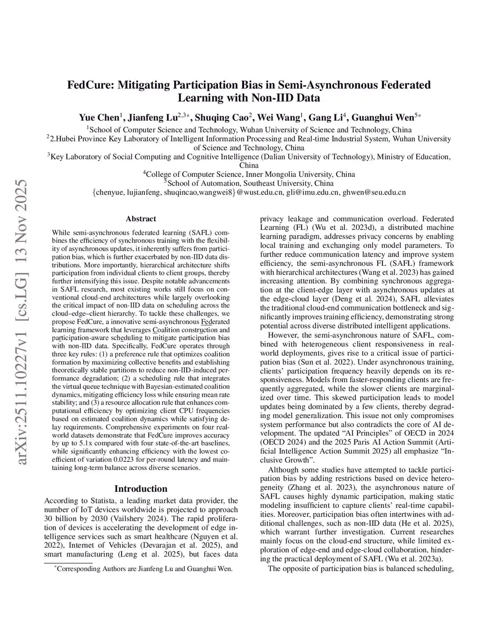 While semi-asynchronous federated learning (SAFL) combines the efficiency of synchronous training with the flexibility of asynchronous updates, it inherently suffers from participation bias, which is further exacerbated by non-IID data distributions. More importantly, hierarchical architecture shifts participation from individual clients to client groups, thereby further intensifying this issue. Despite notable advancements in SAFL research, most existing works still focus on conventional cloud-end architectures while largely overlooking the critical impact of non-IID data on scheduling across the cloud-edge-client hierarchy. To tackle these challenges, we propose FedCure, an innovative semi-asynchronous Federated learning framework that leverages coalition construction and participation-aware scheduling to mitigate participation bias with non-IID data. Specifically, FedCure operates through three key rules: (1) a preference rule that optimizes coalition formation by maximizing collective benefits and establishing theoretically stable partitions to reduce non-IID-induced performance degradation; (2) a scheduling rule that integrates the virtual queue technique with Bayesian-estimated coalition dynamics, mitigating efficiency loss while ensuring mean rate stability; and (3) a resource allocation rule that enhances computational efficiency by optimizing client CPU frequencies based on estimated coalition dynamics while satisfying delay requirements. Comprehensive experiments on four real-world datasets demonstrate that FedCure improves accuracy by up to 5.1x compared with four state-of-the-art baselines, while significantly enhancing efficiency with the lowest coefficient of variation 0.0223 for per-round latency and maintaining long-term balance across diverse scenarios.