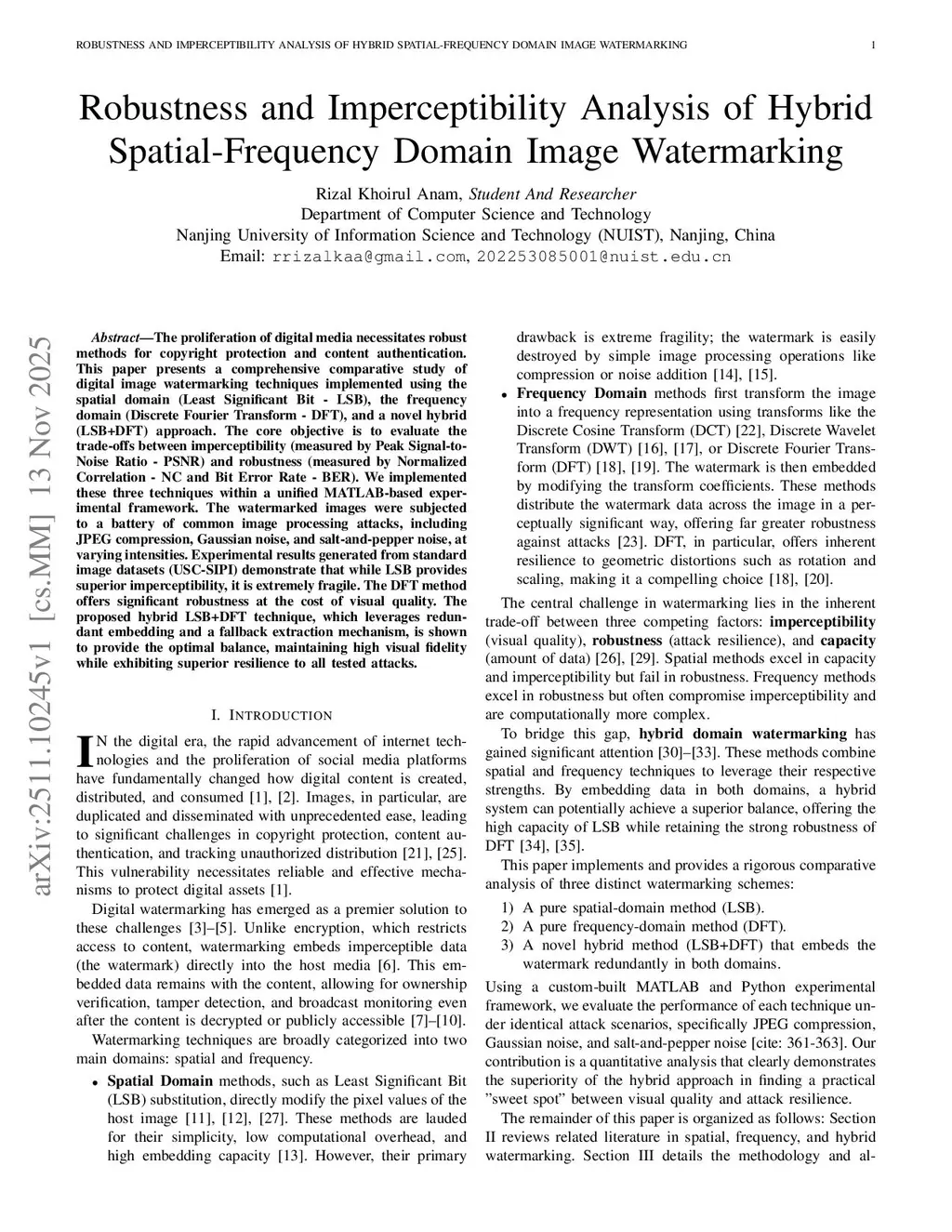 Robustness and Imperceptibility Analysis of Hybrid Spatial-Frequency Domain Image Watermarking