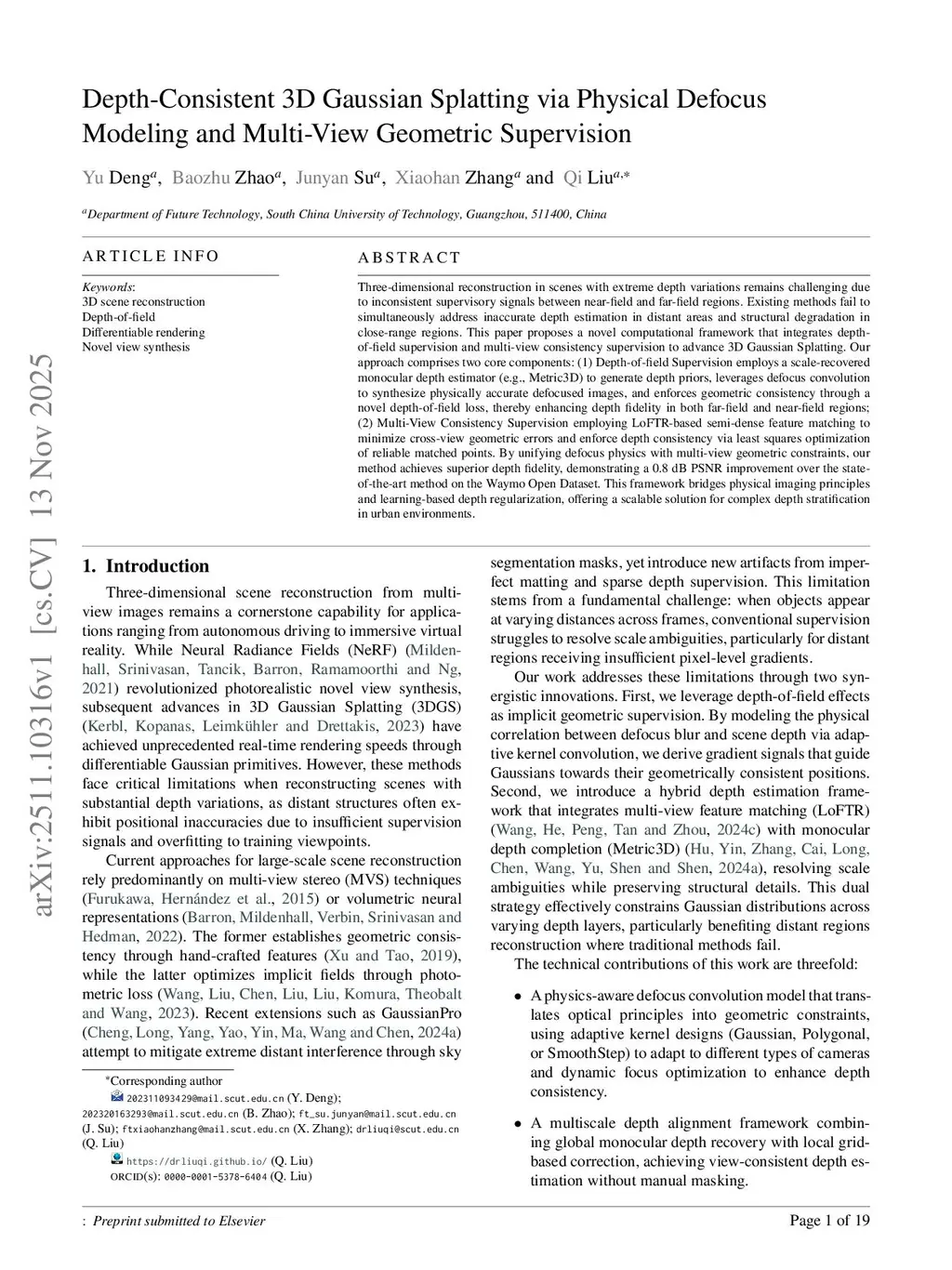 Three-dimensional reconstruction in scenes with extreme depth variations remains challenging due to inconsistent supervisory signals between near-field and far-field regions. Existing methods fail to simultaneously address inaccurate depth estimation in distant areas and structural degradation in close-range regions. This paper proposes a novel computational framework that integrates depth-of-field supervision and multi-view consistency supervision to advance 3D Gaussian Splatting. Our approach comprises two core components: (1) Depth-of-field Supervision employs a scale-recovered monocular depth estimator (e.g., Metric3D) to generate depth priors, leverages defocus convolution to synthesize physically accurate defocused images, and enforces geometric consistency through a novel depth-of-field loss, thereby enhancing depth fidelity in both far-field and near-field regions; (2) Multi-View Consistency Supervision employing LoFTR-based semi-dense feature matching to minimize cross-view geometric errors and enforce depth consistency via least squares optimization of reliable matched points. By unifying defocus physics with multi-view geometric constraints, our method achieves superior depth fidelity, demonstrating a 0.8 dB PSNR improvement over the state-of-the-art method on the Waymo Open Dataset. This framework bridges physical imaging principles and learning-based depth regularization, offering a scalable solution for complex depth stratification in urban environments.