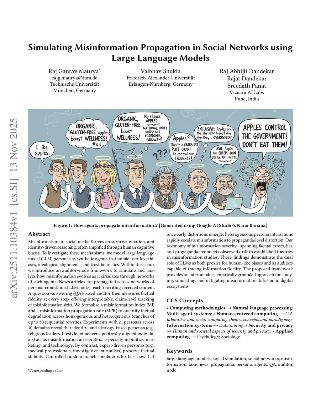 Misinformation on social media thrives on surprise, emotion, and identity-driven reasoning, often amplified through human cognitive biases. To investigate these mechanisms, we model large language model (LLM) personas as synthetic agents that mimic user-level biases, ideological alignments, and trust heuristics. Within this setup, we introduce an auditor--node framework to simulate and analyze how misinformation evolves as it circulates through networks of such agents. News articles are propagated across networks of persona-conditioned LLM nodes, each rewriting received content. A question--answering-based auditor then measures factual fidelity at every step, offering interpretable, claim-level tracking of misinformation drift. We formalize a misinformation index and a misinformation propagation rate to quantify factual degradation across homogeneous and heterogeneous branches of up to 30 sequential rewrites. Experiments with 21 personas across 10 domains reveal that identity- and ideology-based personas act as misinformation accelerators, especially in politics, marketing, and technology. By contrast, expert-driven personas preserve factual stability. Controlled-random branch simulations further show that once early distortions emerge, heterogeneous persona interactions rapidly escalate misinformation to propaganda-level distortion. Our taxonomy of misinformation severity -- spanning factual errors, lies, and propaganda -- connects observed drift to established theories in misinformation studies. These findings demonstrate the dual role of LLMs as both proxies for human-like biases and as auditors capable of tracing information fidelity. The proposed framework provides an interpretable, empirically grounded approach for studying, simulating, and mitigating misinformation diffusion in digital ecosystems.