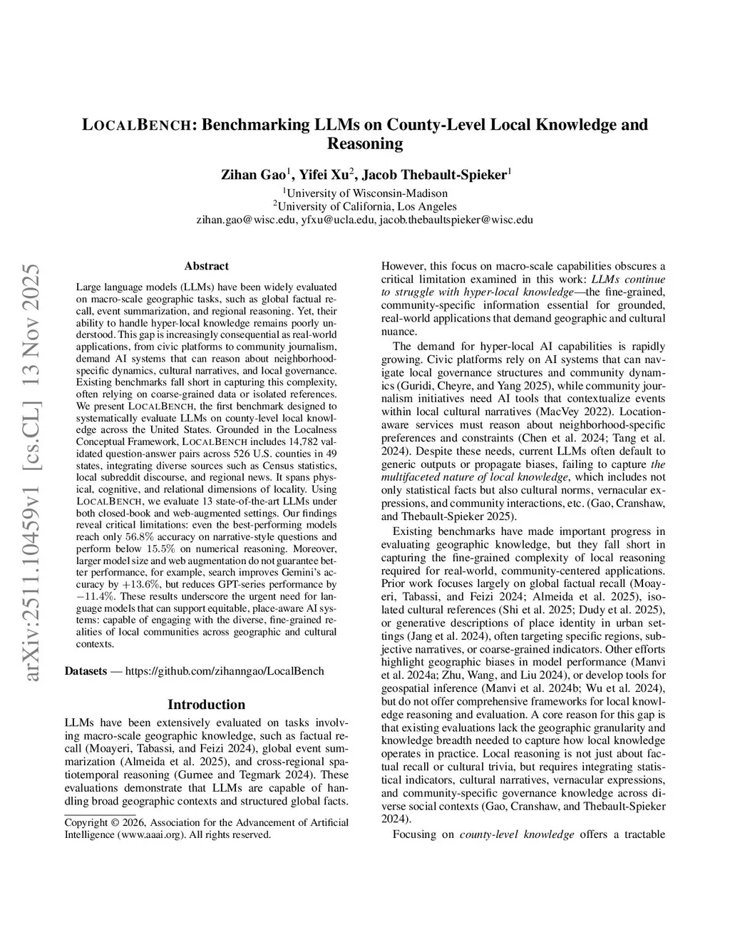 Large language models (LLMs) have been widely evaluated on macro-scale geographic tasks, such as global factual recall, event summarization, and regional reasoning. Yet, their ability to handle hyper-local knowledge remains poorly understood. This gap is increasingly consequential as real-world applications, from civic platforms to community journalism, demand AI systems that can reason about neighborhood-specific dynamics, cultural narratives, and local governance. Existing benchmarks fall short in capturing this complexity, often relying on coarse-grained data or isolated references. We present LocalBench, the first benchmark designed to systematically evaluate LLMs on county-level local knowledge across the United States. Grounded in the Localness Conceptual Framework, LocalBench includes 14,782 validated question-answer pairs across 526 U.S. counties in 49 states, integrating diverse sources such as Census statistics, local subreddit discourse, and regional news. It spans physical, cognitive, and relational dimensions of locality. Using LocalBench, we evaluate 13 state-of-the-art LLMs under both closed-book and web-augmented settings. Our findings reveal critical limitations: even the best-performing models reach only 56.8% accuracy on narrative-style questions and perform below 15.5% on numerical reasoning. Moreover, larger model size and web augmentation do not guarantee better performance, for example, search improves Gemini's accuracy by +13.6%, but reduces GPT-series performance by -11.4%. These results underscore the urgent need for language models that can support equitable, place-aware AI systems: capable of engaging with the diverse, fine-grained realities of local communities across geographic and cultural contexts.