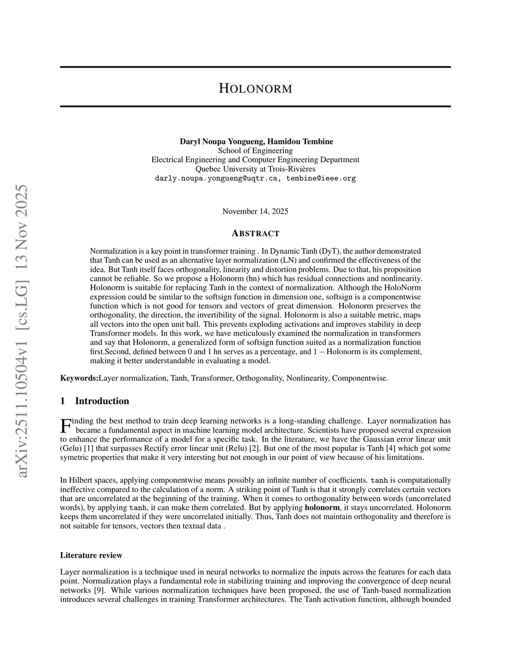 Normalization is a key point in transformer training . In Dynamic Tanh (DyT), the author demonstrated that Tanh can be used as an alternative layer normalization (LN) and confirmed the effectiveness of the idea. But Tanh itself faces orthogonality, linearity and distortion problems. Due to that, his proposition cannot be reliable. So we propose a Holonorm (hn) which has residual connections and nonlinearity. Holonorm is suitable for replacing Tanh in the context of normalization. Although the HoloNorm expression could be similar to the softsign function in dimension one, softsign is a componentwise function which is not good for tensors and vectors of great dimension. Holonorm preserves the orthogonality, the direction, the invertibility of the signal. Holonorm is also a suitable metric, maps all vectors into the open unit ball. This prevents exploding activations and improves stability in deep Transformer models. In this work, we have meticulously examined the normalization in transformers and say that Holonorm, a generalized form of softsign function suited as a normalization functionthis http URL, defined between 0 and 1 hn serves as a percentage, and is its complement, making it better understandable in evaluating a model.
