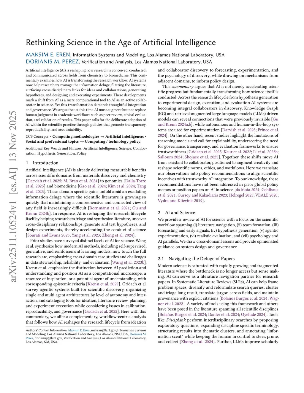 Artificial intelligence (AI) is reshaping how research is conceived, conducted, and communicated across fields from chemistry to biomedicine. This commentary examines how AI is transforming the research workflow. AI systems now help researchers manage the information deluge, filtering the literature, surfacing cross-disciplinary links for ideas and collaborations, generating hypotheses, and designing and executing experiments. These developments mark a shift from AI as a mere computational tool to AI as an active collaborator in science. Yet this transformation demands thoughtful integration and governance. We argue that at this time AI must augment but not replace human judgment in academic workflows such as peer review, ethical evaluation, and validation of results. This paper calls for the deliberate adoption of AI within the scientific practice through policies that promote transparency, reproducibility, and accountability.