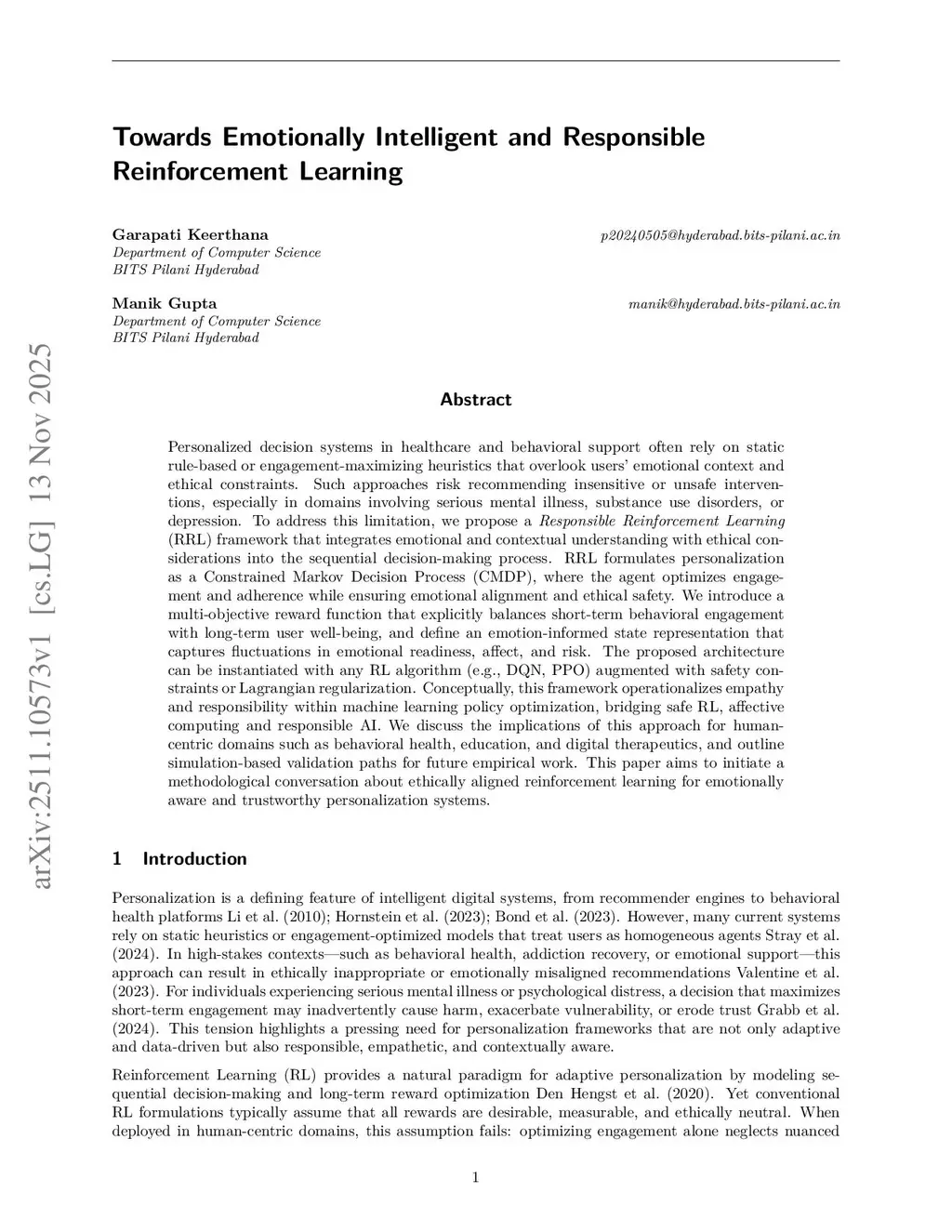 Personalized decision systems in healthcare and behavioral support often rely on static rule-based or engagement-maximizing heuristics that overlook users' emotional context and ethical constraints. Such approaches risk recommending insensitive or unsafe interventions, especially in domains involving serious mental illness, substance use disorders, or depression. To address this limitation, we propose a Responsible Reinforcement Learning (RRL) framework that integrates emotional and contextual understanding with ethical considerations into the sequential decision-making process. RRL formulates personalization as a Constrained Markov Decision Process (CMDP), where the agent optimizes engagement and adherence while ensuring emotional alignment and ethical safety. We introduce a multi-objective reward function that explicitly balances short-term behavioral engagement with long-term user well-being, and define an emotion-informed state representation that captures fluctuations in emotional readiness, affect, and risk. The proposed architecture can be instantiated with any RL algorithm (e.g., DQN, PPO) augmented with safety constraints or Lagrangian regularization. Conceptually, this framework operationalizes empathy and responsibility within machine learning policy optimization, bridging safe RL, affective computing and responsible AI. We discuss the implications of this approach for human-centric domains such as behavioral health, education, and digital therapeutics, and outline simulation-based validation paths for future empirical work. This paper aims to initiate a methodological conversation about ethically aligned reinforcement learning for emotionally aware and trustworthy personalization systems.
