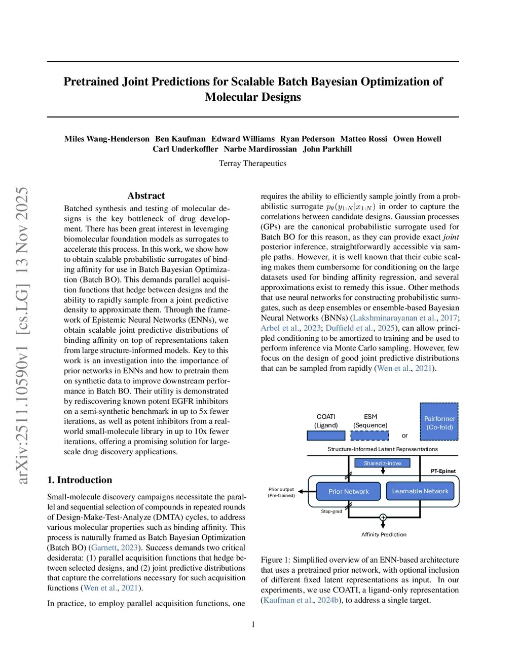 Batched synthesis and testing of molecular designs is the key bottleneck of drug development. There has been great interest in leveraging biomolecular foundation models as surrogates to accelerate this process. In this work, we show how to obtain scalable probabilistic surrogates of binding affinity for use in Batch Bayesian Optimization (Batch BO). This demands parallel acquisition functions that hedge between designs and the ability to rapidly sample from a joint predictive density to approximate them. Through the framework of Epistemic Neural Networks (ENNs), we obtain scalable joint predictive distributions of binding affinity on top of representations taken from large structure-informed models. Key to this work is an investigation into the importance of prior networks in ENNs and how to pretrain them on synthetic data to improve downstream performance in Batch BO. Their utility is demonstrated by rediscovering known potent EGFR inhibitors on a semi-synthetic benchmark in up to 5x fewer iterations, as well as potent inhibitors from a real-world small-molecule library in up to 10x fewer iterations, offering a promising solution for large-scale drug discovery applications.