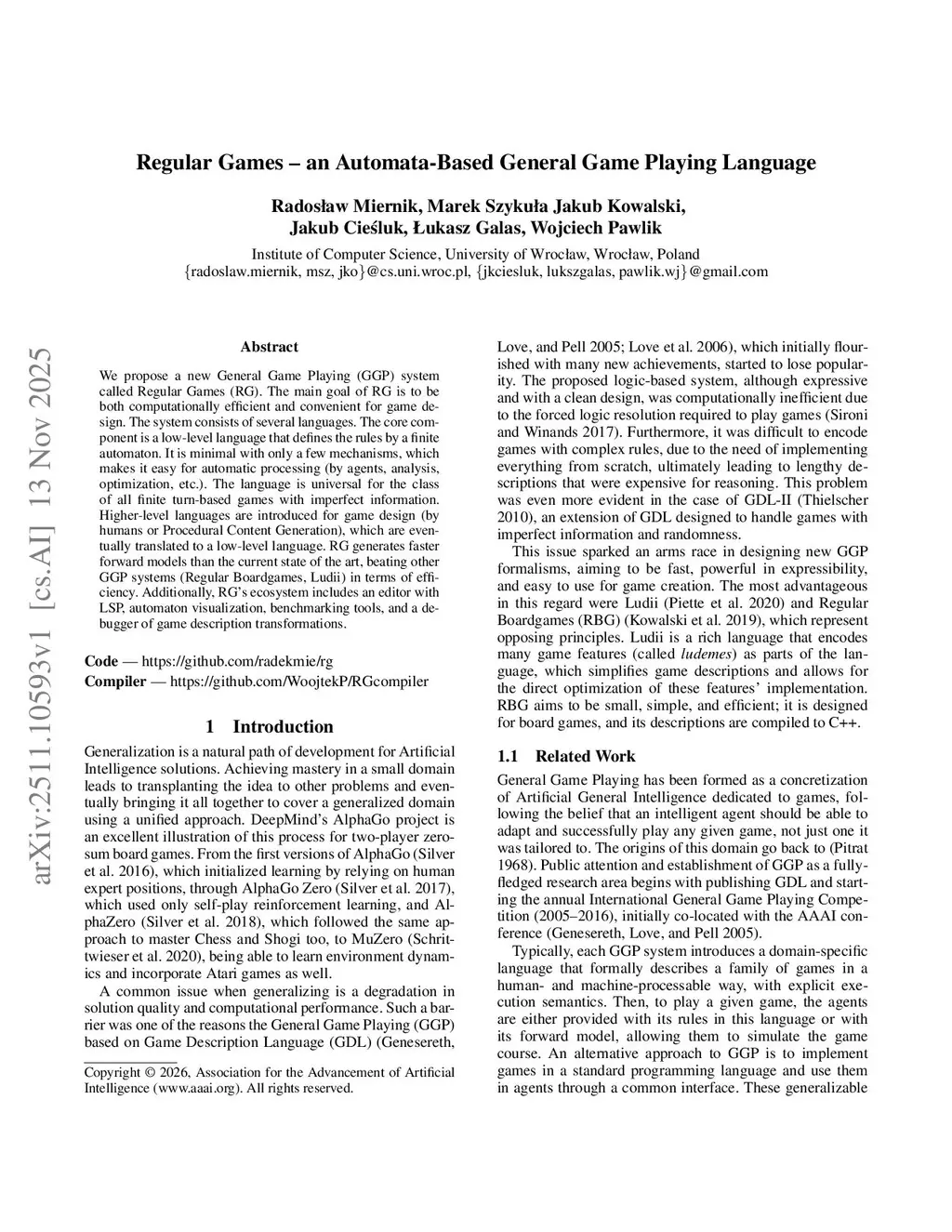 We propose a new General Game Playing (GGP) system called Regular Games (RG). The main goal of RG is to be both computationally efficient and convenient for game design. The system consists of several languages. The core component is a low-level language that defines the rules by a finite automaton. It is minimal with only a few mechanisms, which makes it easy for automatic processing (by agents, analysis, optimization, etc.). The language is universal for the class of all finite turn-based games with imperfect information. Higher-level languages are introduced for game design (by humans or Procedural Content Generation), which are eventually translated to a low-level language. RG generates faster forward models than the current state of the art, beating other GGP systems (Regular Boardgames, Ludii) in terms of efficiency. Additionally, RG's ecosystem includes an editor with LSP, automaton visualization, benchmarking tools, and a debugger of game description transformations.