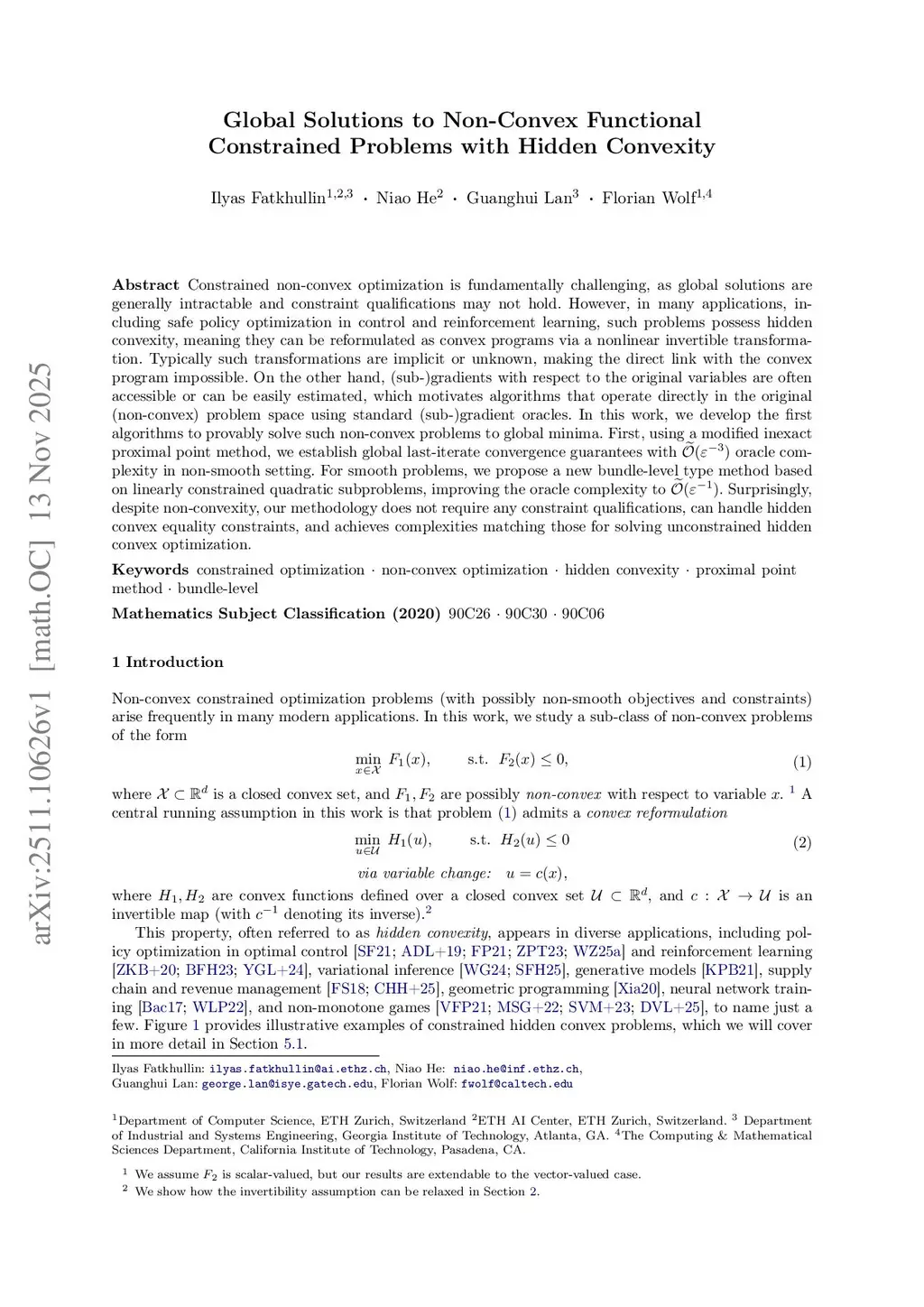 Constrained non-convex optimization is fundamentally challenging, as global solutions are generally intractable and constraint qualifications may not hold. However, in many applications, including safe policy optimization in control and reinforcement learning, such problems possess hidden convexity, meaning they can be reformulated as convex programs via a nonlinear invertible transformation. Typically such transformations are implicit or unknown, making the direct link with the convex program impossible. On the other hand, (sub-)gradients with respect to the original variables are often accessible or can be easily estimated, which motivates algorithms that operate directly in the original (non-convex) problem space using standard (sub-)gradient oracles. In this work, we develop the first algorithms to provably solve such non-convex problems to global minima. First, using a modified inexact proximal point method, we establish global last-iterate convergence guarantees with oracle complexity in non-smooth setting. For smooth problems, we propose a new bundle-level type method based on linearly constrained quadratic subproblems, improving the oracle complexity to . Surprisingly, despite non-convexity, our methodology does not require any constraint qualifications, can handle hidden convex equality constraints, and achieves complexities matching those for solving unconstrained hidden convex optimization.