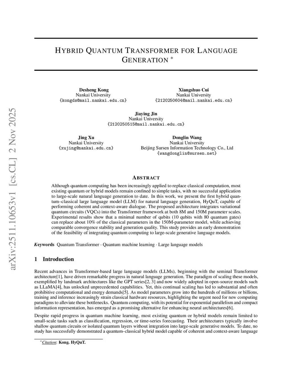 Although quantum computing has been increasingly applied to replace classical computation, most existing quantum or hybrid models remain confined to simple tasks, with no successful application to large-scale natural language generation to date. In this work, we present the first hybrid quantum-classical large language model (LLM) for natural language generation, HyQuT, capable of performing coherent and context-aware dialogue. The proposed architecture integrates variational quantum circuits (VQCs) into the Transformer framework at both 8M and 150M parameter scales. Experimental results show that a minimal number of qubits (10 qubits with 80 quantum gates) can replace about 10% of the classical parameters in the 150M-parameter model, while achieving comparable convergence stability and generation quality. This study provides an early demonstration of the feasibility of integrating quantum computing to large-scale generative language models.