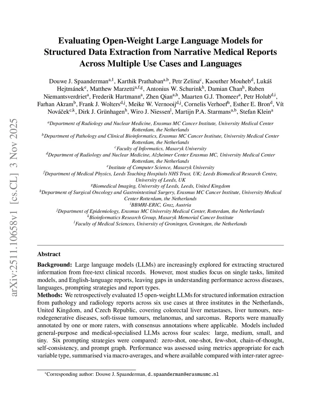 Large language models (LLMs) are increasingly used to extract structured information from free-text clinical records, but prior work often focuses on single tasks, limited models, and English-language reports. We evaluated 15 open-weight LLMs on pathology and radiology reports across six use cases, colorectal liver metastases, liver tumours, neurodegenerative diseases, soft-tissue tumours, melanomas, and sarcomas, at three institutes in the Netherlands, UK, and Czech Republic. Models included general-purpose and medical-specialised LLMs of various sizes, and six prompting strategies were compared: zero-shot, one-shot, few-shot, chain-of-thought, self-consistency, and prompt graph. Performance was assessed using task-appropriate metrics, with consensus rank aggregation and linear mixed-effects models quantifying variance. Top-ranked models achieved macro-average scores close to inter-rater agreement across tasks. Small-to-medium general-purpose models performed comparably to large models, while tiny and specialised models performed worse. Prompt graph and few-shot prompting improved performance by ~13%. Task-specific factors, including variable complexity and annotation variability, influenced results more than model size or prompting strategy. These findings show that open-weight LLMs can extract structured data from clinical reports across diseases, languages, and institutions, offering a scalable approach for clinical data curation.
