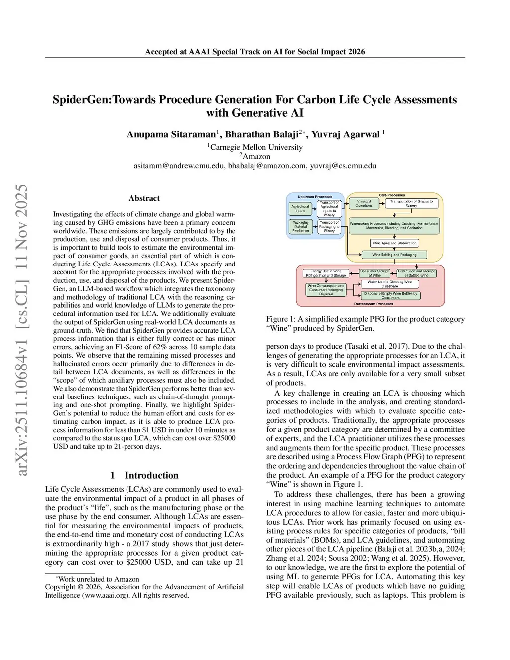 Investigating the effects of climate change and global warming caused by GHG emissions have been a key concern worldwide. These emissions are largely contributed to by the production, use and disposal of consumer products. Thus, it is important to build tools to estimate the environmental impact of consumer goods, an essential part of which is conducting Life Cycle Assessments (LCAs). LCAs specify and account for the appropriate processes involved with the production, use, and disposal of the products. We present SpiderGen, an LLM-based workflow which integrates the taxonomy and methodology of traditional LCA with the reasoning capabilities and world knowledge of LLMs to generate graphical representations of the key procedural information used for LCA, known as Product Category Rules Process Flow Graphs (PCR PFGs). We additionally evaluate the output of SpiderGen by comparing it with 65 real-world LCA documents. We find that SpiderGen provides accurate LCA process information that is either fully correct or has minor errors, achieving an F1-Score of 65% across 10 sample data points, as compared to 53% using a one-shot prompting method. We observe that the remaining errors occur primarily due to differences in detail between LCA documents, as well as differences in the "scope" of which auxiliary processes must also be included. We also demonstrate that SpiderGen performs better than several baselines techniques, such as chain-of-thought prompting and one-shot prompting. Finally, we highlight SpiderGen's potential to reduce the human effort and costs for estimating carbon impact, as it is able to produce LCA process information for less than \1 USD in under 10 minutes as compared to the status quo LCA, which can cost over \25000 USD and take up to 21-person days.