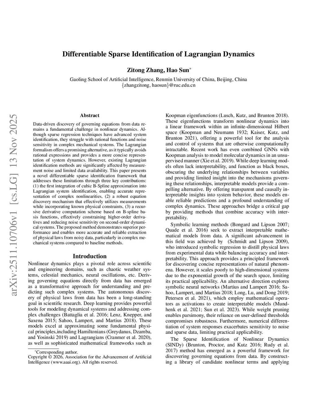 Data-driven discovery of governing equations from data remains a fundamental challenge in nonlinear dynamics. Although sparse regression techniques have advanced system identification, they struggle with rational functions and noise sensitivity in complex mechanical systems. The Lagrangian formalism offers a promising alternative, as it typically avoids rational expressions and provides a more concise representation of system dynamics. However, existing Lagrangian identification methods are significantly affected by measurement noise and limited data availability. This paper presents a novel differentiable sparse identification framework that addresses these limitations through three key contributions: (1) the first integration of cubic B-Spline approximation into Lagrangian system identification, enabling accurate representation of complex nonlinearities, (2) a robust equation discovery mechanism that effectively utilizes measurements while incorporating known physical constraints, (3) a recursive derivative computation scheme based on B-spline basis functions, effectively constraining higher-order derivatives and reducing noise sensitivity on second-order dynamical systems. The proposed method demonstrates superior performance and enables more accurate and reliable extraction of physical laws from noisy data, particularly in complex mechanical systems compared to baseline methods.