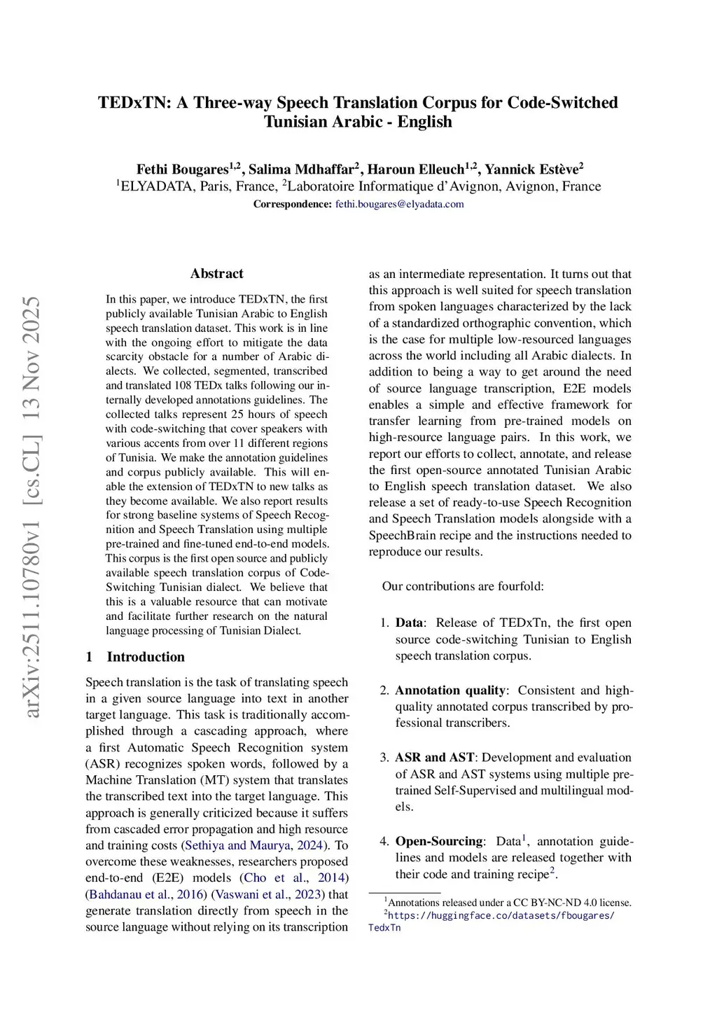 In this paper, we introduce TEDxTN, the first publicly available Tunisian Arabic to English speech translation dataset. This work is in line with the ongoing effort to mitigate the data scarcity obstacle for a number of Arabic dialects. We collected, segmented, transcribed and translated 108 TEDx talks following our internally developed annotations guidelines. The collected talks represent 25 hours of speech with code-switching that cover speakers with various accents from over 11 different regions of Tunisia. We make the annotation guidelines and corpus publicly available. This will enable the extension of TEDxTN to new talks as they become available. We also report results for strong baseline systems of Speech Recognition and Speech Translation using multiple pre-trained and fine-tuned end-to-end models. This corpus is the first open source and publicly available speech translation corpus of Code-Switching Tunisian dialect. We believe that this is a valuable resource that can motivate and facilitate further research on the natural language processing of Tunisian Dialect.