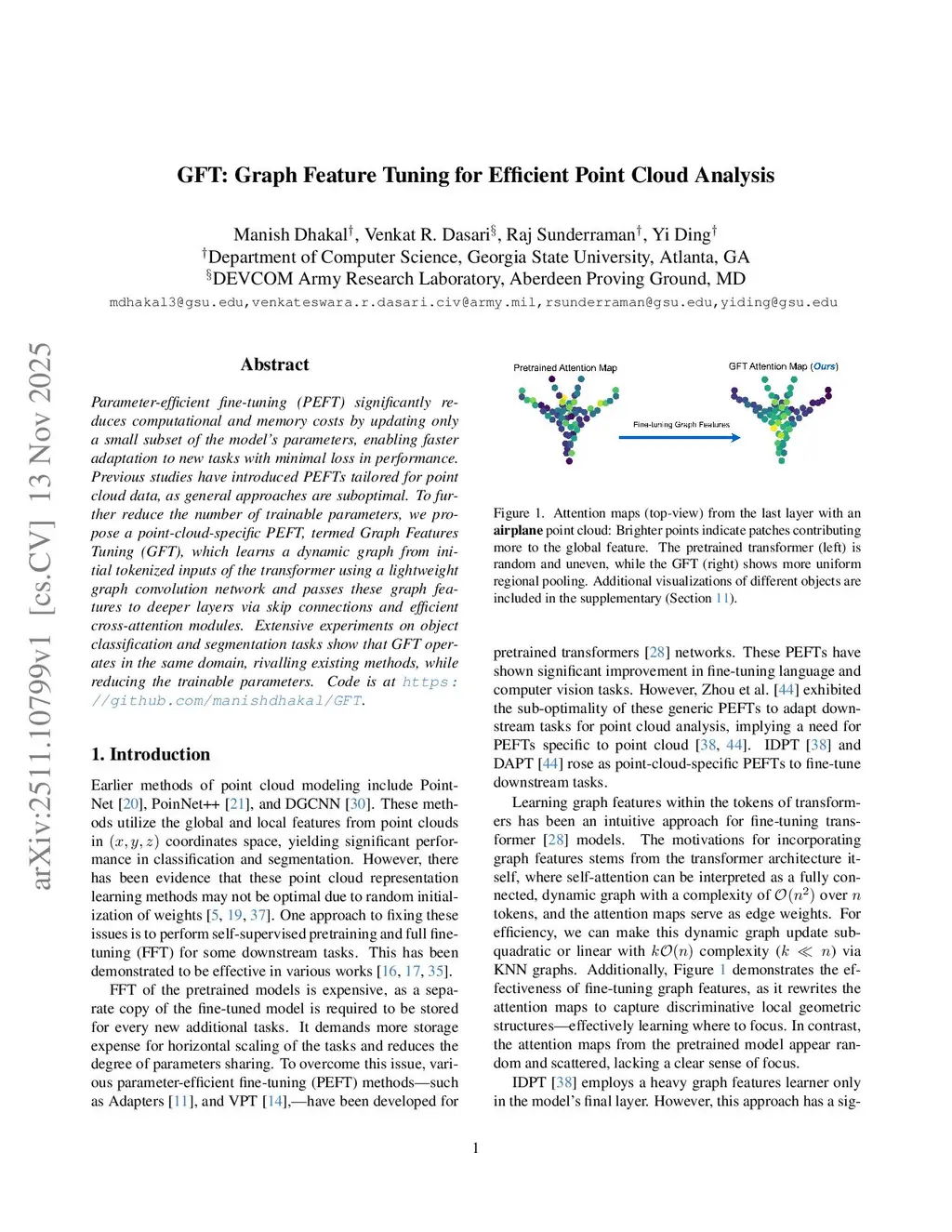 Parameter-efficient fine-tuning (PEFT) significantly reduces computational and memory costs by updating only a small subset of the model's parameters, enabling faster adaptation to new tasks with minimal loss in performance. Previous studies have introduced PEFTs tailored for point cloud data, as general approaches are suboptimal. To further reduce the number of trainable parameters, we propose a point-cloud-specific PEFT, termed Graph Features Tuning (GFT), which learns a dynamic graph from initial tokenized inputs of the transformer using a lightweight graph convolution network and passes these graph features to deeper layers via skip connections and efficient cross-attention modules. Extensive experiments on object classification and segmentation tasks show that GFT operates in the same domain, rivalling existing methods, while reducing the trainable parameters. Code is available atthis https URL.
