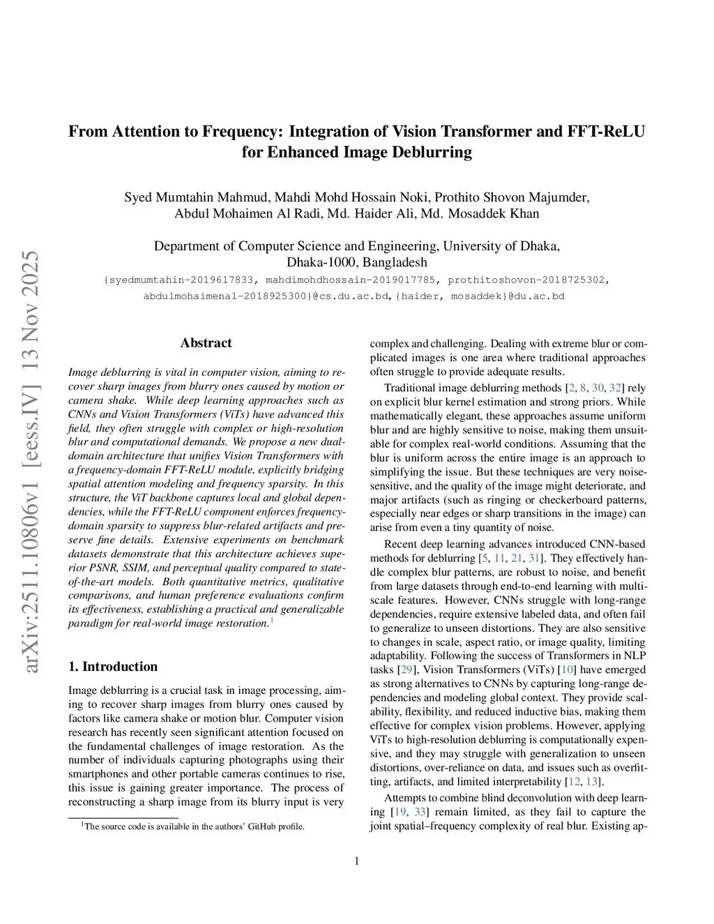 Image deblurring is vital in computer vision, aiming to recover sharp images from blurry ones caused by motion or camera shake. While deep learning approaches such as CNNs and Vision Transformers (ViTs) have advanced this field, they often struggle with complex or high-resolution blur and computational demands. We propose a new dual-domain architecture that unifies Vision Transformers with a frequency-domain FFT-ReLU module, explicitly bridging spatial attention modeling and frequency sparsity. In this structure, the ViT backbone captures local and global dependencies, while the FFT-ReLU component enforces frequency-domain sparsity to suppress blur-related artifacts and preserve fine details. Extensive experiments on benchmark datasets demonstrate that this architecture achieves superior PSNR, SSIM, and perceptual quality compared to state-of-the-art models. Both quantitative metrics, qualitative comparisons, and human preference evaluations confirm its effectiveness, establishing a practical and generalizable paradigm for real-world image restoration.