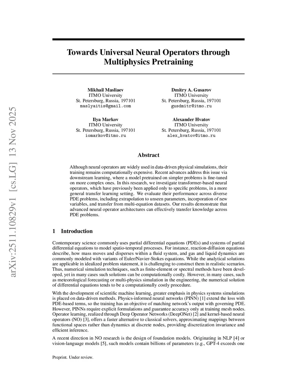 Towards Universal Neural Operators through Multiphysics Pretraining