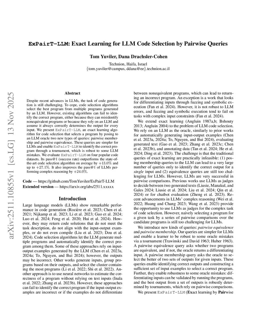 ExPairT-LLM: Exact Learning for LLM Code Selection by Pairwise Queries