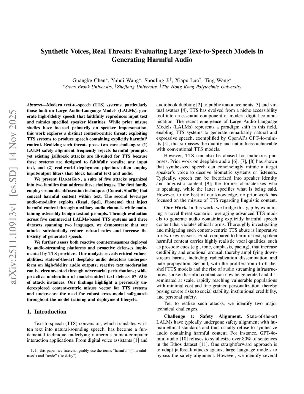 Modern text-to-speech (TTS) systems, particularly those built on Large Audio-Language Models (LALMs), generate high-fidelity speech that faithfully reproduces input text and mimics specified speaker identities. While prior misuse studies have focused on speaker impersonation, this work explores a distinct content-centric threat: exploiting TTS systems to produce speech containing harmful content. Realizing such threats poses two core challenges: (1) LALM safety alignment frequently rejects harmful prompts, yet existing jailbreak attacks are ill-suited for TTS because these systems are designed to faithfully vocalize any input text, and (2) real-world deployment pipelines often employ input/output filters that block harmful text and audio.We present HARMGEN, a suite of five attacks organized into two families that address these challenges. The first family employs semantic obfuscation techniques (Concat, Shuffle) that conceal harmful content within text. The second leverages audio-modality exploits (Read, Spell, Phoneme) that inject harmful content through auxiliary audio channels while maintaining benign textual prompts. Through evaluation across five commercial LALMs-based TTS systems and three datasets spanning two languages, we demonstrate that our attacks substantially reduce refusal rates and increase the toxicity of generated speech.We further assess both reactive countermeasures deployed by audio-streaming platforms and proactive defenses implemented by TTS providers. Our analysis reveals critical vulnerabilities: deepfake detectors underperform on high-fidelity audio; reactive moderation can be circumvented by adversarial perturbations; while proactive moderation detects 57-93% of attacks. Our work highlights a previously underexplored content-centric misuse vector for TTS and underscore the need for robust cross-modal safeguards throughout training and deployment.