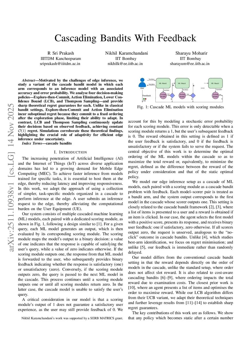 Motivated by the challenges of edge inference, we study a variant of the cascade bandit model in which each arm corresponds to an inference model with an associated accuracy and error probability. We analyse four decision-making policies-Explore-then-Commit, Action Elimination, Lower Confidence Bound (LCB), and Thompson Sampling-and provide sharp theoretical regret guarantees for each. Unlike in classical bandit settings, Explore-then-Commit and Action Elimination incur suboptimal regret because they commit to a fixed ordering after the exploration phase, limiting their ability to adapt. In contrast, LCB and Thompson Sampling continuously update their decisions based on observed feedback, achieving constant O(1) regret. Simulations corroborate these theoretical findings, highlighting the crucial role of adaptivity for efficient edge inference under uncertainty.