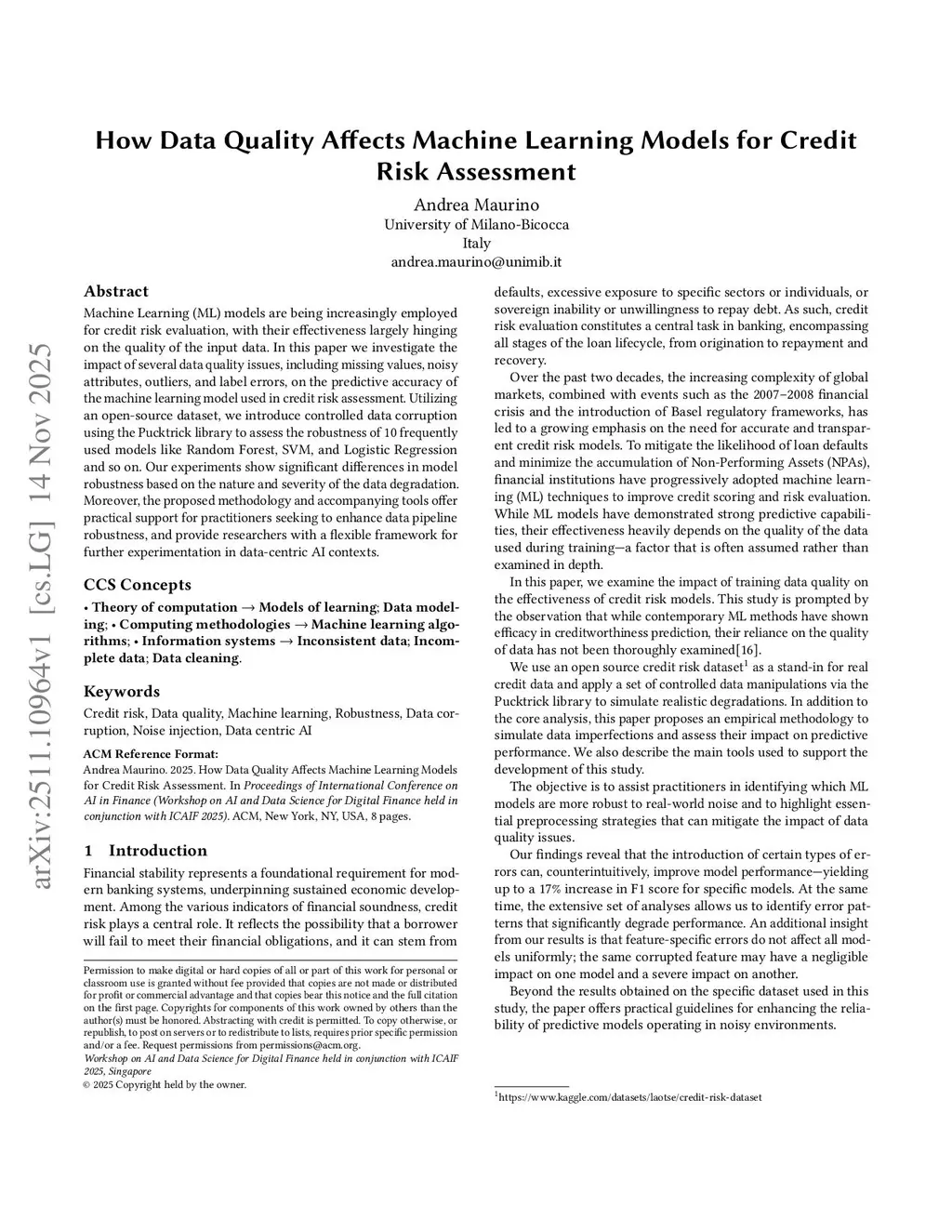 Machine Learning (ML) models are being increasingly employed for credit risk evaluation, with their effectiveness largely hinging on the quality of the input data. In this paper we investigate the impact of several data quality issues, including missing values, noisy attributes, outliers, and label errors, on the predictive accuracy of the machine learning model used in credit risk assessment. Utilizing an open-source dataset, we introduce controlled data corruption using the Pucktrick library to assess the robustness of 10 frequently used models like Random Forest, SVM, and Logistic Regression and so on. Our experiments show significant differences in model robustness based on the nature and severity of the data degradation. Moreover, the proposed methodology and accompanying tools offer practical support for practitioners seeking to enhance data pipeline robustness, and provide researchers with a flexible framework for further experimentation in data-centric AI contexts.