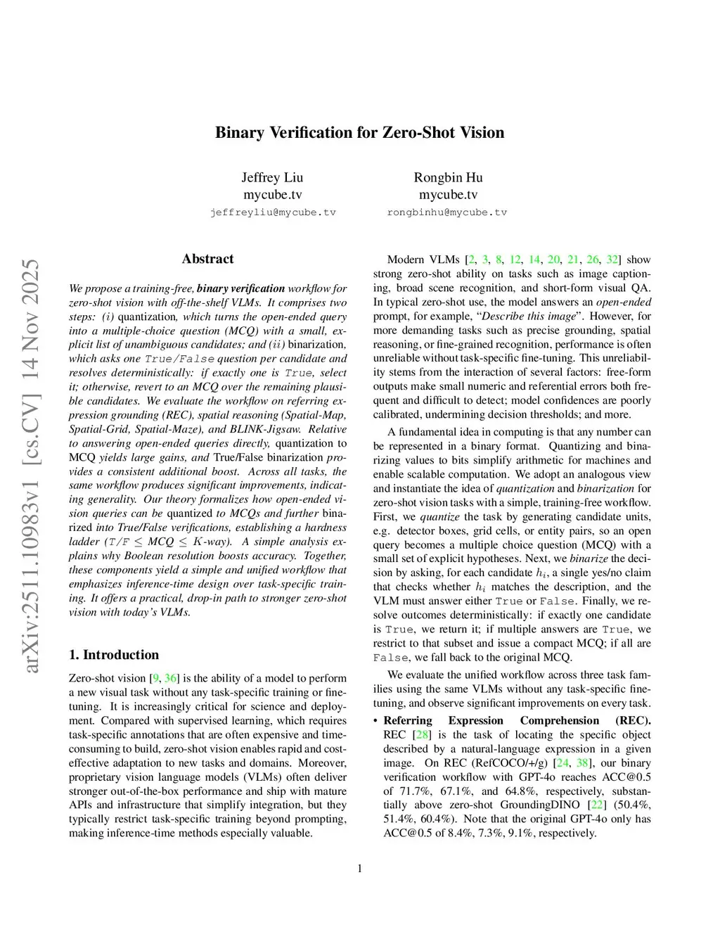 We propose a training-free, binary verification workflow for zero-shot vision with off-the-shelf VLMs. It comprises two steps: (i) quantization, which turns the open-ended query into a multiple-choice question (MCQ) with a small, explicit list of unambiguous candidates; and (ii) binarization, which asks one True/False question per candidate and resolves deterministically: if exactly one is True, select it; otherwise, revert to an MCQ over the remaining plausible candidates. We evaluate the workflow on referring expression grounding (REC), spatial reasoning (Spatial-Map, Spatial-Grid, Spatial-Maze), and BLINK-Jigsaw. Relative to answering open-ended queries directly, quantization to MCQ yields large gains, and True/False binarization provides a consistent additional boost. Across all tasks, the same workflow produces significant improvements, indicating generality. We further integrate the proposed REC workflow into a real-world video processing and editing system, and present the system architecture and end-to-end pipeline in the paper. Together, these components yield a simple and unified workflow that emphasizes inference-time design over task-specific training. It offers a practical, drop-in path to stronger zero-shot vision with today's VLMs.