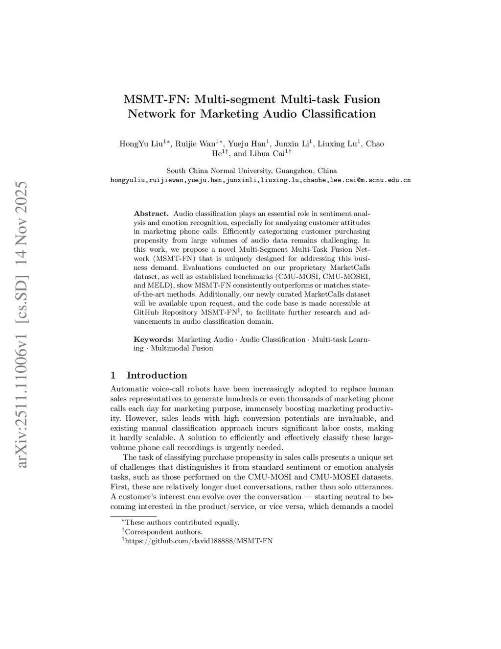 Audio classification plays an essential role in sentiment analysis and emotion recognition, especially for analyzing customer attitudes in marketing phone calls. Efficiently categorizing customer purchasing propensity from large volumes of audio data remains challenging. In this work, we propose a novel Multi-Segment Multi-Task Fusion Network (MSMT-FN) that is uniquely designed for addressing this business demand. Evaluations conducted on our proprietary MarketCalls dataset, as well as established benchmarks (CMU-MOSI, CMU-MOSEI, and MELD), show MSMT-FN consistently outperforms or matches state-of-the-art methods. Additionally, our newly curated MarketCalls dataset will be available upon request, and the code base is made accessible at GitHub Repository MSMT-FN, to facilitate further research and advancements in audio classification domain.