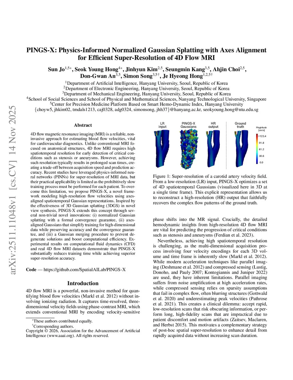 4D flow magnetic resonance imaging (MRI) is a reliable, non-invasive approach for estimating blood flow velocities, vital for cardiovascular diagnostics. Unlike conventional MRI focused on anatomical structures, 4D flow MRI requires high spatiotemporal resolution for early detection of critical conditions such as stenosis or aneurysms. However, achieving such resolution typically results in prolonged scan times, creating a trade-off between acquisition speed and prediction accuracy. Recent studies have leveraged physics-informed neural networks (PINNs) for super-resolution of MRI data, but their practical applicability is limited as the prohibitively slow training process must be performed for each patient. To overcome this limitation, we propose PINGS-X, a novel framework modeling high-resolution flow velocities using axes-aligned spatiotemporal Gaussian representations. Inspired by the effectiveness of 3D Gaussian splatting (3DGS) in novel view synthesis, PINGS-X extends this concept through several non-trivial novel innovations: (i) normalized Gaussian splatting with a formal convergence guarantee, (ii) axes-aligned Gaussians that simplify training for high-dimensional data while preserving accuracy and the convergence guarantee, and (iii) a Gaussian merging procedure to prevent degenerate solutions and boost computational efficiency. Experimental results on computational fluid dynamics (CFD) and real 4D flow MRI datasets demonstrate that PINGS-X substantially reduces training time while achieving superior super-resolution accuracy. Our code and datasets are available atthis https URL.