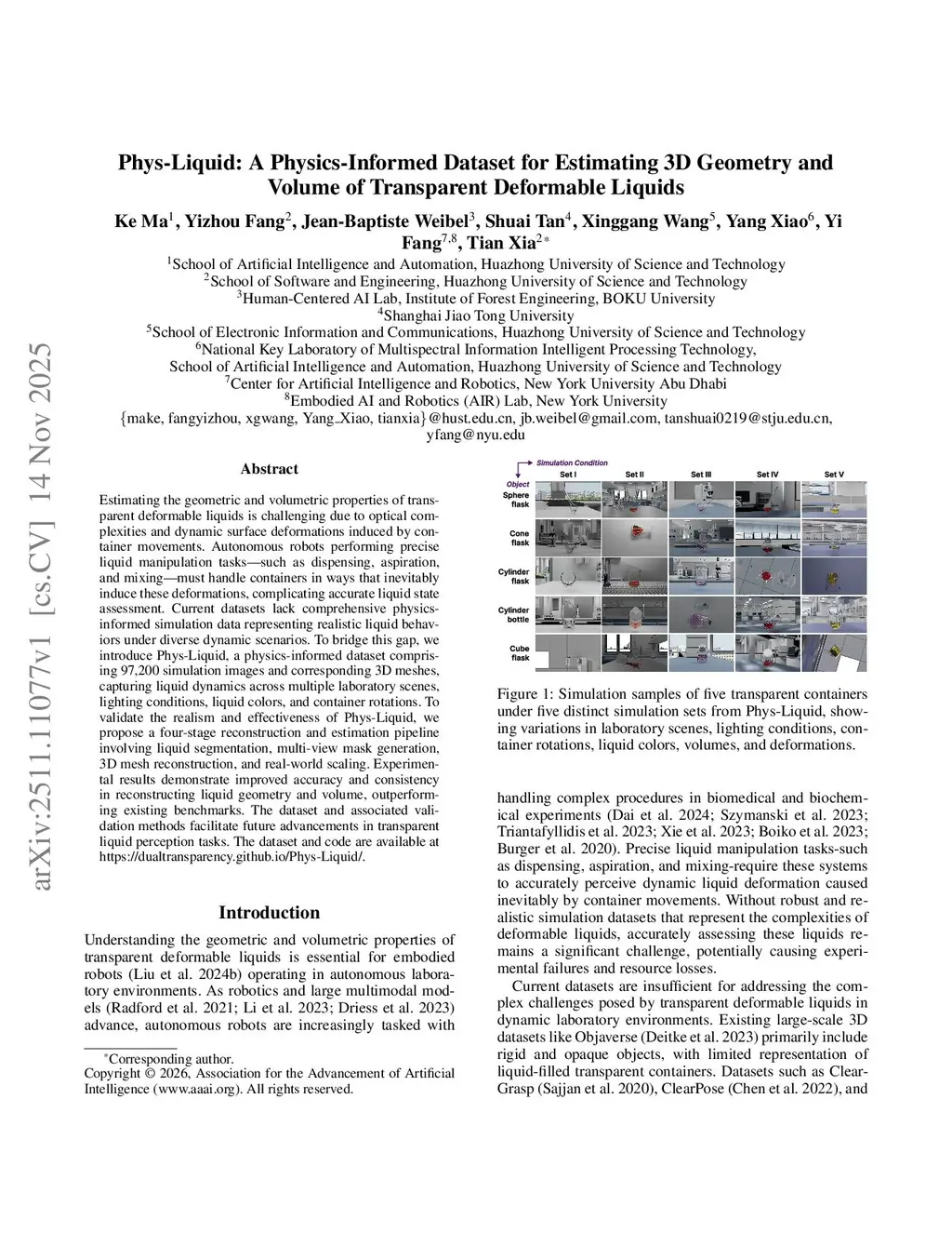 Estimating the geometric and volumetric properties of transparent deformable liquids is challenging due to optical complexities and dynamic surface deformations induced by container movements. Autonomous robots performing precise liquid manipulation tasks, such as dispensing, aspiration, and mixing, must handle containers in ways that inevitably induce these deformations, complicating accurate liquid state assessment. Current datasets lack comprehensive physics-informed simulation data representing realistic liquid behaviors under diverse dynamic scenarios. To bridge this gap, we introduce Phys-Liquid, a physics-informed dataset comprising 97,200 simulation images and corresponding 3D meshes, capturing liquid dynamics across multiple laboratory scenes, lighting conditions, liquid colors, and container rotations. To validate the realism and effectiveness of Phys-Liquid, we propose a four-stage reconstruction and estimation pipeline involving liquid segmentation, multi-view mask generation, 3D mesh reconstruction, and real-world scaling. Experimental results demonstrate improved accuracy and consistency in reconstructing liquid geometry and volume, outperforming existing benchmarks. The dataset and associated validation methods facilitate future advancements in transparent liquid perception tasks. The dataset and code are available atthis https URL.