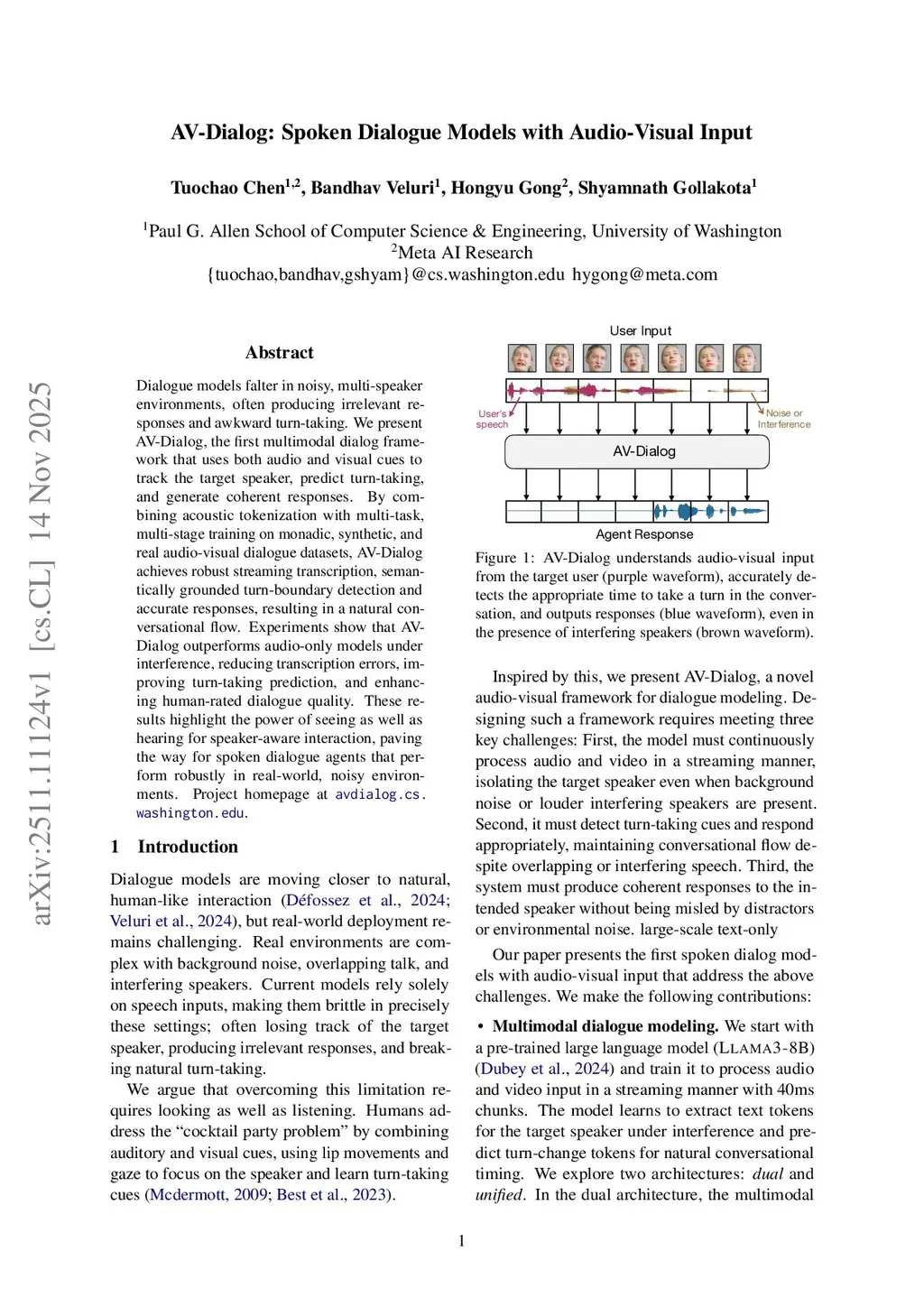 Dialogue models falter in noisy, multi-speaker environments, often producing irrelevant responses and awkward turn-taking. We present AV-Dialog, the first multimodal dialog framework that uses both audio and visual cues to track the target speaker, predict turn-taking, and generate coherent responses. By combining acoustic tokenization with multi-task, multi-stage training on monadic, synthetic, and real audio-visual dialogue datasets, AV-Dialog achieves robust streaming transcription, semantically grounded turn-boundary detection and accurate responses, resulting in a natural conversational flow. Experiments show that AV-Dialog outperforms audio-only models under interference, reducing transcription errors, improving turn-taking prediction, and enhancing human-rated dialogue quality. These results highlight the power of seeing as well as hearing for speaker-aware interaction, paving the way for {spoken} dialogue agents that perform {robustly} in real-world, noisy environments.