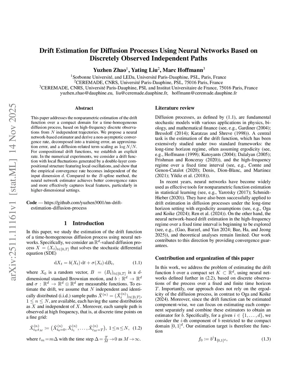 This paper addresses the nonparametric estimation of the drift function over a compact domain for a time-homogeneous diffusion process, based on high-frequency discrete observations from NN independent trajectories. We propose a neural network-based estimator and derive a non-asymptotic convergence rate, decomposed into a training error, an approximation error, and a diffusion-related term scaling as logN/N{\log N}/{N}. For compositional drift functions, we establish an explicit rate. In the numerical experiments, we consider a drift function with local fluctuations generated by a double-layer compositional structure featuring local oscillations, and show that the empirical convergence rate becomes independent of the input dimension dd. Compared to the BB-spline method, the neural network estimator achieves better convergence rates and more effectively captures local features, particularly in higher-dimensional settings.