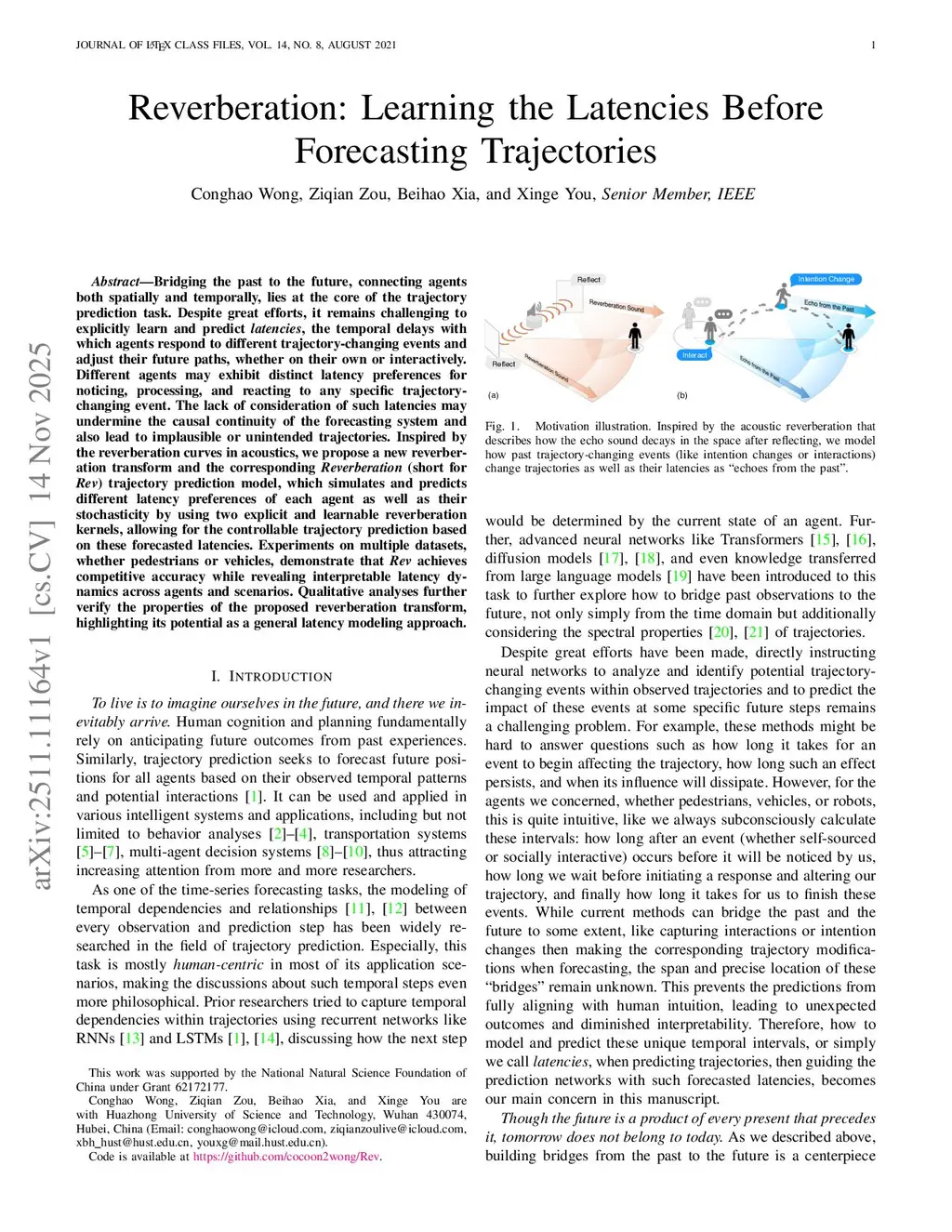 Bridging the past to the future, connecting agents both spatially and temporally, lies at the core of the trajectory prediction task. Despite great efforts, it remains challenging to explicitly learn and predict latencies, i.e., response intervals or temporal delays with which agents respond to various trajectory-changing events and adjust their future paths, whether on their own or interactively. Different agents may exhibit distinct latency preferences for noticing, processing, and reacting to a specific trajectory-changing event. The lack of consideration of such latencies may undermine the causal continuity of forecasting systems, leading to implausible or unintended trajectories. Inspired by reverberation in acoustics, we propose a new reverberation transform and the corresponding Reverberation (short for Rev) trajectory prediction model, which predicts both individual latency preferences and their stochastic variations accordingly, by using two explicit and learnable reverberation kernels, enabling latency-conditioned and controllable trajectory prediction of both non-interactive and social latencies. Experiments on multiple datasets, whether pedestrians or vehicles, demonstrate that Rev achieves competitive accuracy while revealing interpretable latency dynamics across agents and scenarios. Qualitative analyses further verify the properties of the reverberation transform, highlighting its potential as a general latency modeling approach.