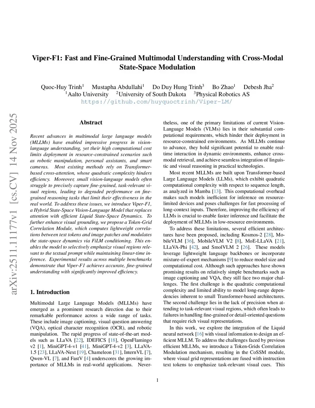 Recent advances in multimodal large language models (MLLMs) have enabled impressive progress in vision-language understanding, yet their high computational cost limits deployment in resource-constrained scenarios such as robotic manipulation, personal assistants, and smart cameras. Most existing methods rely on Transformer-based cross-attention, whose quadratic complexity hinders efficiency. Moreover, small vision-language models often struggle to precisely capture fine-grained, task-relevant visual regions, leading to degraded performance on fine-grained reasoning tasks that limit their effectiveness in the real world. To address these issues, we introduce Viper-F1, a Hybrid State-Space Vision-Language Model that replaces attention with efficient Liquid State-Space Dynamics. To further enhance visual grounding, we propose a Token-Grid Correlation Module, which computes lightweight correlations between text tokens and image patches and modulates the state-space dynamics via FiLM conditioning. This enables the model to selectively emphasize visual regions relevant to the textual prompt while maintaining linear-time inference. Experimental results across multiple benchmarks demonstrate that Viper-F1 achieves accurate, fine-grained understanding with significantly improved efficiency.