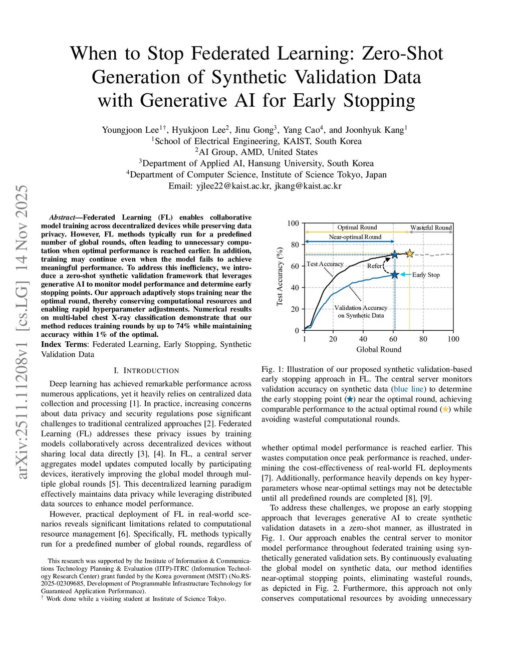 Federated Learning (FL) enables collaborative model training across decentralized devices while preserving data privacy. However, FL methods typically run for a predefined number of global rounds, often leading to unnecessary computation when optimal performance is reached earlier. In addition, training may continue even when the model fails to achieve meaningful performance. To address this inefficiency, we introduce a zero-shot synthetic validation framework that leverages generative AI to monitor model performance and determine early stopping points. Our approach adaptively stops training near the optimal round, thereby conserving computational resources and enabling rapid hyperparameter adjustments. Numerical results on multi-label chest X-ray classification demonstrate that our method reduces training rounds by up to 74% while maintaining accuracy within 1% of the optimal.