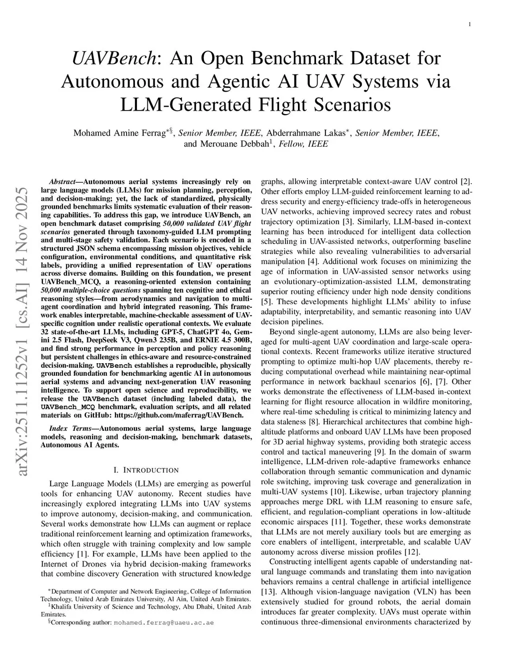 Autonomous aerial systems increasingly rely on large language models (LLMs) for mission planning, perception, and decision-making, yet the lack of standardized and physically grounded benchmarks limits systematic evaluation of their reasoning capabilities. To address this gap, we introduce UAVBench, an open benchmark dataset comprising 50,000 validated UAV flight scenarios generated through taxonomy-guided LLM prompting and multi-stage safety validation. Each scenario is encoded in a structured JSON schema that includes mission objectives, vehicle configuration, environmental conditions, and quantitative risk labels, providing a unified representation of UAV operations across diverse domains. Building on this foundation, we present UAVBench_MCQ, a reasoning-oriented extension containing 50,000 multiple-choice questions spanning ten cognitive and ethical reasoning styles, ranging from aerodynamics and navigation to multi-agent coordination and integrated reasoning. This framework enables interpretable and machine-checkable assessment of UAV-specific cognition under realistic operational contexts. We evaluate 32 state-of-the-art LLMs, including GPT-5, ChatGPT-4o, Gemini 2.5 Flash, DeepSeek V3, Qwen3 235B, and ERNIE 4.5 300B, and find strong performance in perception and policy reasoning but persistent challenges in ethics-aware and resource-constrained decision-making. UAVBench establishes a reproducible and physically grounded foundation for benchmarking agentic AI in autonomous aerial systems and advancing next-generation UAV reasoning intelligence. To support open science and reproducibility, we release the UAVBench dataset, the UAVBench_MCQ benchmark, evaluation scripts, and all related materials on GitHub atthis https URL