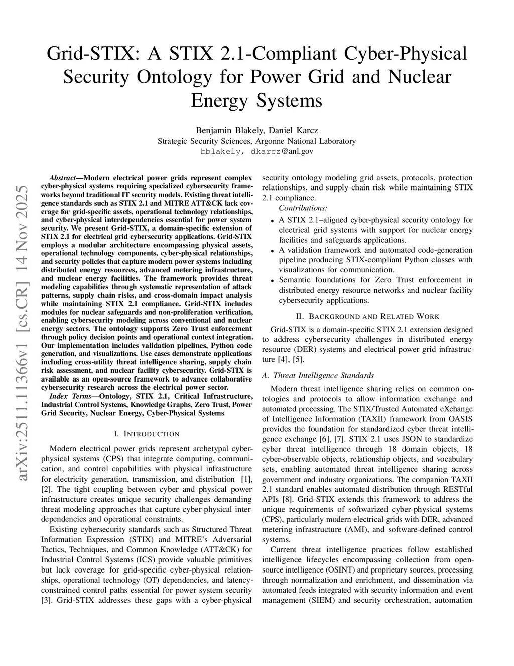 Modern electrical power grids represent complex cyber-physical systems requiring specialized cybersecurity frameworks beyond traditional IT security models. Existing threat intelligence standards such as STIX 2.1 and MITRE ATT\&CK lack coverage for grid-specific assets, operational technology relationships, and cyber-physical interdependencies essential for power system security. We present Grid-STIX, a domain-specific extension of STIX 2.1 for electrical grid cybersecurity applications. Grid-STIX employs a modular architecture encompassing physical assets, operational technology components, cyber-physical relationships, and security policies that capture modern power systems including distributed energy resources, advanced metering infrastructure, and nuclear energy facilities. The framework provides threat modeling capabilities through systematic representation of attack patterns, supply chain risks, and cross-domain impact analysis while maintaining STIX 2.1 compliance. Grid-STIX includes modules for nuclear safeguards and non-proliferation verification, enabling cybersecurity modeling across conventional and nuclear energy sectors. The ontology supports Zero Trust enforcement through policy decision points and operational context integration. Our implementation includes validation pipelines, Python code generation, and visualizations. Use cases demonstrate applications including cross-utility threat intelligence sharing, supply chain risk assessment, and nuclear facility cybersecurity. Grid-STIX is available as an open-source framework to advance collaborative cybersecurity research across the electrical power sector.